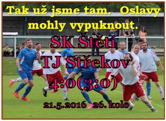 Kdo by před začátkem sezóny věřil, že už 21. května 2016 5 kol před koncem budeme stát jeden krůček před oslavou vítězství v Ústeckém přeboru pro tento ročník. Tou poslední překážkou byl TJ Střekov a zisk 2 bodů proti předposlednímu celku tabulky znamenal jistotu a důvod k oslavám.