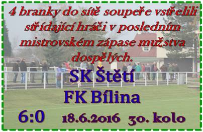 Rozlučkou s letošní veleúspěšnou sezónou byl zápas proti mužstvu ze středu tabulky. Chystalo se slavnostní předání poháru a oslavy po zápase byly naplánovány na sobotu, ale asi i na neděli. Samotné utkání se muselo libit také. V prvních 10 minutách střídala šance, šanci Jako první zahrozili hosté, ale střela po rychlém útoku skončila ve 20. řadě za brankou. Na opačném konci hřiště zase hlavičkoval Slanička, ale žádná super šance to nebyla. V gólovém postavení se po přihrávce od Mencla ocitl Vacek, ale mířil vedle. V 9. minutě jsme nechali po rohu hlavičkovat Mergla a míč se otřel o tyč. Bílina v těchto momentech hodně zlobila a za další minutu jsme mohli poděkovat Kloubovy v brance, když pohotovým zákrokem zpacifikoval útočníka soupeře. Pak se na straně soupeře 2x žlutilo, kopali jsme i roh, ale radostná chvíle pro náš kolektiv přišla ve 27. minutě. Střelu Tichého obrana vyrazila před sebe a z dorážky se prvního jarního gólu dočkal David Mencl. Vstřelená branka našemu mužstvu dodala chuť i na další góly. Ještě do poločasu hlavičkoval vedle Slanička a ve 40. minutě z volného přímého kopu stejný hráč trefil jen zeď. Do druhého poločasu jsme vyběhli se 3 změnami v sestavě a za 4 minuty jsme se radovali podruhé v zápase. Z hranice šestnáctky vypálil Tichý a Kovačka se po míči natahoval marně. V 55. minutě se hodně nahlas začali ozývat střídající hráči. Důraz v šestnáctce byl tou hlavní devízou Hrdého, když se zmocnil míče a s přehledem zvýšil naše vedení už na 3:0. V 61. minutě mohl dokonce skórovat podruhé, ale proti stála tyčka. Jedinou větší šanci ve 2. poločase si Bílina připravila v 67. minutě, ale v nepřehledné situaci před naší brankou jsme nakonec míč odvrátili na roh. Divácky pohlednou akci načal centr Hrdého, když si u zadní tyče vyhlédl číhajícího Tichého, ale jeho hlavička v brance neskončila. Další střídající hráč se zapsal do listiny střelců v 73. minutě. Byl jím Lukáš Lelek, který si s velkou rozvahou přichystal míč ke střele a uklidil ho přesně k tyči na 4:0. Konečné skóre to ale zdaleka nebylo. Nejmladší hráč v naší sestavě, který se na hřišti objevil až v průběhu utkání, Jan Grepl, prokázal, že čich na góly mu nechybí. Obrana se mylně domnívala, že bude pískáno postavení mimo hru, Grepl toho využil a skóre se měnilo na 5:0. Tečkou za letošním ročníkem byla branka stejné hráče. Připravil ji Lukáš Stejskal a razítko na 6:0 přidal již několikrát zmiňovaný Jan Grepl. A protože Hrobce prohrály v Modlanech 7:3, tak jsme si na své konto připsali i další nej. Nejvíce vstřelených branek v soutěži. Hned po zápase nám zástupce ÚKFS Jan Novotný předal pohár za vítězství v Ústeckém přeboru pro ročník 2015-2016 a zahájil tak zasloužené oslavy.