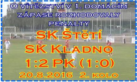 Po úspěšném vstupu do divizní soutěže před týdnem v Novém Boru nás čekala domácí premiéra proti silnému týmu Kladna, které loni usilovalo o postup do ČFL. Hosté zahrozili jako první, když po centru do našeho vápna minuli jen těsně levou tyč. Obranu Kladna jsme trochu více zaměstnali až v 11. minutě, kdy jsme zahrávali roh nakrátko, ale k vítěznému konci to nevedlo. Házenkářským zákrokem hájil v 17. minutě čisté konto Michovský v naší brance, ale stejně bylo odpískáno postavení mimo hru. Přesný roh na zadní tyč předvedl Kalina v dresu Kladna, ale hlavička jednoho z jeho spoluhráčů přesná nebyla. Úvodní mírná aktivita hostů z úvodu zápasu se pomalu přesouvala na naše kopačky. Trestný kop zahrál Stejskal a nejlépe si na něj naskočil Hrdý. Bohužel branku o nějaký ten kousek netrefil. I další slibnou možnost si vypracoval náš kolektiv, ale přihrávka Vokouna až na Beláka nedošla. Mrzet nás to ale příliš nemuselo. Ve 30. minutě jsme založili rychlou akci, míč se ocitl hned několikrát v nadějné příležitosti na kopačkách štětských hráčů, ale až ten poslední Vladimír Kucler dokázal dostat míč do sítě na 1:0. Radost nemusela mít dlouhého trvání. Tak dlouho jsme váhali s odkopem, až se ho zmocnil soupeř a jen díky nepřesné koncovce jsme byli stále o krok napřed. V závěru poločasu ještě hezky mířil Stejskal, ale brankář Tesař byl připraven. Druhý poločas zahájil soupeř 3 šancemi během 8 minut. Nebezpečnou střelu na roh srážel Michovský a poradit si musel i dalším pokusem Kladna o 3 minuty později. Tu největší šanci měl protivník v 54. minutě, kdy se po levé straně jak lasička protáhl útočník, ale stejně tak pohotově zachraňoval i brankář Štětí. Uběhlo 60 minut zápasu a zvýšit na 2:0 mohl Belák. Jeho střela však velkému zklamání mezi 3 tyčemi neskončila. Přes několik obránců prošel v 66. minutě Hrdý, ale jeho dloubák z velkého úhlu přesné parametry koncovky neměl. V 69. minutě levá strana naší obrany zůstala úplně otevřená a to nemohlo dobře dopadnout. První pokus jsme ještě odvrátili, ale proti hlavičkové dorážce Jana Procházky už jsme zůstali bezmocní. Vrátit vedení na naši stranu mohl o 4. minuty později Belák, ale i ve své druhé zápasové gólovce mířil vedle. Žádné z mužstev se s remízou smířit nechtělo. Hosté kopali několik volných přímých kopů a na druhé straně zase Stejskal neprostřelil hradbu těl před ním. Úplný konec zápasu patřil Kladnu. Hlavička těsně vedle, pak zase zázračně vyrážel míč Michovský, a když ani v 1. minutě nastavení střeleckou kanonádu před naší brankou soupeř nevyužil, tak tu byl konec utkání a na řadu musela přijít loterie pokutových kopů s úspěšným koncem pro hosty.