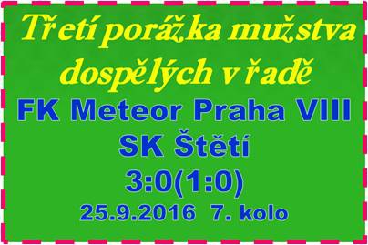 Do Prahy na Meteor jsem jeli po domácí ztrátě s Nymburkem navíc bez některých hráčů, kteří jsou buď zraněni jako třeba Stejskal s Michovským, který má zlomený nos nebo Vokoun, který plní reprezentační povinnosti ve futsale do 21 let. S poraženeckou náladou jsme ale nenastupovali, i když hned první útok domácích zaváněl gólem. Úplně sám nikým nehlídán zůstal před naší brankou Fíček a ještě štěstí, že míč po jeho hlavičce skončil nad brankou. V úvodních minutách jsme hodně míčů ztráceli a nedokázali založit souvislejší akci. Do pokutového území soupeře jsme se dostali až v 10. minutě a byl z toho roh. Domácí byli i nadále nebezpečnější a snažili se vstřelit vedoucí branku. Povedlo se jim to v 19. minutě po 3. rohu za sebou, kdy naše obrana nedokázala pokrýt Daňhela u bližší tyče a ten hlavou skóroval na 1:0. Po vstřelené brance začala být na hřišti cítit nervozita a rozhodčí uděloval žluté karty. V 1. poločase naši hráči viděli 4.,domácí ani jednu. V dalším průběhu 1. půle už moc šancí k vidění nebylo. Příležitost soupeře ve 32. minutě zneškodnil Kloub v brance a 2 volné přímé kopy našeho týmu také žádným nebezpečím nebyly. 2. poločas zahájili domácí rohem a za dalších 5 minut na naši branku zase postupoval útočník domácích. Záchrannou brzdu zatahoval pronásledovatel Jiří Šimral a dobře to dopadlo. Míč se postupně přesouval na kopačky našich hráčů a hra se odehrávala více na polovině domácích. Začínali jsme věřit, že nějaká ta šance spolu s vyrovnáním přijde. Po trestném kopu v 55. minutě jsme soupeře přitlačili před jeho brankou a hezká byla i střela Beláka k bližší tyči, kterou brankář vyrážel na roh. Posílili jsme i útok. Odešel obránce Čámský a přišel útočník Böhm. Běžela však 64. minuta a dění na hřišti zasáhla červená karta. Nervy na uzdě neudržel Malák, strčil do soupeře a viděl kartu již zmiňované barvy. V době, kdy jsme se nadechovali k náporu, to byla velká nezodpovědnost, která týmu hodně uškodila. Zbraně jsme ale nesložili a i v 10 jsme chtěli vyrovnat. 12 minut před koncem jsme při jednom z útoků přečíslili obranu a chybělo jen přesnější zakončení Vacka po zpětné přihrávce. Mnohem úspěšnější byli domácí hned z rychlého protiútoku a neobsazený Stibora zvýšil na 2:0. Ještě jsme zkusili aspoň nepříznivý výsledek korigovat, ale proti střele Vacka z volného přímého kopu úspěšně zasáhl brankář Michňa. V poslední minutě utkání, kdy už jsme rezignovali na bránění, se domácí Meteor prosadil ještě jednou, když na konečných 3:0 opět z rychlého útoku zakončoval Minárčik.