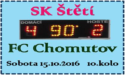 V 10. kole divizní soutěže jsme doma přivítali FC Chomutov, kterému se venku daří. Získal zde 8 bodů. Doma ve 4 zápasech jen 3. Lavička našeho týmu byla hodně prázdná. Vyloučení v minulém zápase, služební cesty a zranění dala některým hráčům pro tento týden volno. Soupeř měl před zápasem na náš tým náskok 3 bodů a jeho vítězství by znamenalo další únik v tabulce. Začalo se 2 rohy na každé straně, ale ani v jednom případě z toho žádná vážnější situace nebyla. V 9. a 13. minutě hostující kolektiv zahrával 2 volné přímé kopy v nebezpečné vzdálenosti od naší branky. Nejprve zprava, z pohledu naší obrany a pak pro změnu zase z druhé strany. V obou případech jsme si ale poradili a branku uchránili. Mezitím pohotově po rychlém brejku na druhé straně zakončoval Belák, ale mušku přesnou neměl. Na časomíře naskočila 18. minutu, když jsme chybovali v rozehrávce přes střed hřiště. Hosté se nebojácně vydali do našeho pokutového území a Martin Boček zakončil na 1:0 pro Chomutov. Vyrovnáno mohlo být do minuty, ale Tichý po průniku do vápna brankáře Zaťka neprostřelil. Vedení jsme soupeři nechtěli dlouho nechat a šance na vyrovnání byly. Po náběhu Stejskala do pokutového území míč ve 21. minutě nepříjemně odskočil a bylo po šanci. Stejný hráč to zkusil za chvilku z dost těžkého úhlu a nebýt pohotového zákroku brankáře, tak mohlo být srovnáno. Závěrečné minuty první půle patřily hostům. Nejdřív musel Michovský velmi rychle couvat, aby ještě stačil vytěsnit míč padající za jeho záda z kopačky Slaničky bna roh. Ve 40. minutě, ale už moc dělat nemohl. Před brankou zůstal osamocený Boček a svojí 2. brankou v zápase zvýšil náskok Chomutova už na 2:0. Do 2. poločasu došlo ke 2 změnám v naší sestavě z důvodů zdravotních, a jak později ukázalo, byly to změny velmi důležité. Náš tým ještě na začátku 2. poločasu přežil velkou příležitost soupeře. Postaral se o to Michovský v brance nádherným zákrokem. Pak už ale začala na hřišti dominovat naše jedenáctka. Hlavičkoval Slanička a efektním zákrokem likvidoval brankář. Po trestném kopu Vokouna z hranice šestnáctky pálil Stejskal, ale branku vysoko přestřelil. Dobrou příležitost měli i hosté a dík za úspěšný zákrok patřil Michovskému. Brankový pytel se otevřel v 67. minutě. Böhm si udělal prsotor v šestnáctce míč, nahrál Slaničkovi a míč po jeho střele na bližší tyč rozvlnil síť. Štětí ožilo. Za další minutu pro změnu Slanička pěkným centrem našel volného Böhma a ten střelou o zem srovnal na 2:2. 71. minuta a obrat v utkání byl dokonán úplně. Vokoun našel mezi 2 beky nabíhajícího Böhma a ten se střelou podél brankáře nemýlil. Během 4 minut se výsledek změnil z 0:2 na 3:2 pro domácí. Nebylo to ale všechno, protože v 75. minutě děravou obranu hostů nachytal Böhma přihrávkou na Vokouna a ten svojí premiérovou brankou v dresu Štětí zvýšil náskok na rozdíl 2 branek. Vedení 4:2 čtvrthodiny před koncem dávalo už velkou naději na vítězství. Ve fotbale je ale vždy rozhodnuto až po závěrečném hvizdu rozhodčího. Na hřišti se také v jeho konci začalo hodně žlutit. Hráči obou mužstev obdrželi plno žlutých karet. Vidět byly také šance na obou stranách. V 79. minutě zakončil volný přímý kop Chomutov střelou těsně vedle. Před branku se po lajně dostal Stejskal, ale spoluhráče nenašel. Velkou gólovku měli hosté 5 minut před koncem, ale opět to byl strážce naší svatyně, který mužstvo podržel. 2 minuty před skončením normální hrací doby zase branku Štěti těsně minul Boček a 3. gólu ze svých kopaček se nedočkal. Další šanci už spokojení domácí diváci neviděli a hráči Štětí mohli slavit 2. letošní vítězství před vlastním publikem.