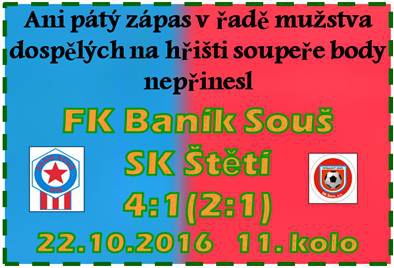 Souš v předchozích 4 domácích zápasech prohrála zatím jen jednou a to v posledním zápase s Neratovicemi. Naše mužstvo se k zápasu dostavilo s cenným skalpem z minulého zápasu s Chomutovem, ale v sestavě chyběl dvoubrankový střelec našeho týmu, právě z tohoto zápasu, Jiří Böhm. Domácí zahrávali už ve 3. minutě volný přímý kop a míč po jeho zahrání skončil mimo hřiště. Slibně se vyvíjel rychlý útok našeho týmu o chvilku později, ale rozběhnutý Belák byl chycen do ofsajdového postavení. Velké chyby v podobě ztráty míče se dopustil Vacek na hranici šestnáctky, ale hráč domácích střílel z bezprostřední blízkosti vedle. Uvodní desetiminutovka zajímavých momentů skončila brankou, ale bohužel v naší síti. O míč jsme zbytečně přišli ve středu a před brankou nepokrytý kapitán domácích Václav Štípek poprvé rozvlnil síť naší branky. 17. minuta vyvolala bouři emocí na naší straně, jak na hřišti, tak i v řadách štětských fanoušků. Postavení mimo hru, které signalizoval pomezní rozhodčí před lavičkou domácích, bylo velkou chybou, kterou viděli nejenom ti, co byli ve stejném postavení na druhé straně hřiště, jako rozhodčí, ale dobře to bylo viditelné i v jiných místech na stadionu. Vyrovnávací branky jsme se dočkali o 3 minuty později. Stejskal s Belákem se dokázali dostat až za obránce, vystřelit se rozhodl prvně jmenovaný a bylo to 1:1. I další možnost skórovat se nabízela naší jedenáctce, ale domácí včas zatáhl za brzdu a míč dostali do autu. Pak už se ale do velkých brankových příležitostí začali dostávat domácí. Míč zahrávaný z levé strany obrany proletěl podél brankové čáry, ale ani jeden z hráčů Souše nedokázal na míč dosáhnout. Ve 33. minutě jsme nedokázali dlouho poletující míč v naší šestnáctce odkopnout do bezpečí, až se dostal na nohu soupeře, který branku naštěstí pro nás minul. Osudovou pro náš kolektiv se stala 35. minuta. Po krásné střele Christofa z dobrých 22 metrů se Michovský natahoval, jak jen to šlo, ale i tak byl krátký. Za další 2 minuty mohlo být ještě hůře, ale hlavičku jednou z hráčů zastavila tyč naší branky. Domácí v těchto minutách zápasu byli lepším týmem a jen díky nepřesné mušce jsme prohrávali jen o branku. I tak jsme ale mohli jít do šaten za remízového stavu nebýt dalšího vymyšleného a odmávaného ofsajdu asistentem Tomášem Kynclem, který zastavil Tomáše Beláka nechávajícího obránce za svými zády. Druhý poločas pro nás začal pro smutně. Hráč domácích si pohybem ruky zpracoval míč a toho využil skvěle přes hlavu zakončující Junek. 1:3 z našeho pohledu. Marné byli naše reklamace u hlavního rozhodčího Libora Šimečka. Ten hráčům vysvětloval, že ruka byla u těla. Byl to další důležitý moment utkání, který signalizoval, že v Souši nám růže v tomto směru nepokvetou. V 56. minutě po centru Vokouna těsně před Tichým odkopl míč na roh Matyáš. Zahrávali jsme i volný přímý kop, ale míč Vokounovi na nohu nejlépe nesedl. 2x zastavil slibně se rozvíjející šanci našeho týmu také praporek pro změnu asistenta znamenající postavení mimo hru. V ofsajdu nebyl ale hráč domácích, který velmi snadno vyhrál souboj jeden na jednoho a po jeho přesné přihrávce zakončoval Štípek už na 4:1. Pomalu se začínala rodit vysoká porážka. Smířit s tím se nechtěl Slanička, ale jeho střelu v 66. minutě vyrazil dobře postavený brankář Unger Poradil si i v 72. minutě s dobře mířeným pokusem Vacka do šibenice a míč vyškrábl na roh. Snaha korigovat byla až do konce, ale k úspěchu jsme se nedopracovali.