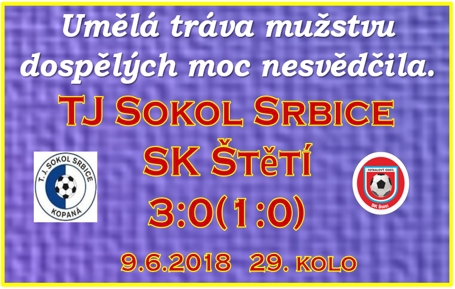 Už dopoledne Most přestřílel Neštěmice na jeho hřišti a zajistil si tak jedno kolo před koncem 1. místo. Do Srbic na umělou trávu už jsme teda neodjížděli jako pronásledovatel Mostu, což před tímto kolem teoreticky stále platilo. Navíc odjelo jen torzo týmu. Pracovní povinnosti, rozlučka s Tomášem Rosickým na Spartě, radostné narození potomka, ale možná i jiné důvody, které zapříčinily, že jsme měli na lavičce jen jednoho náhradníka. V úvodu jsme se ale činili a měli několik menších i větších příležitostí k otevření skóre. V dobrém postavení se ocitl Čámský, ale míč ideálně nezpracoval. Velkou možnost měl i Vokoun. Na začátku akce byl Faust, po jehož průniku se balón dostal právě až k Vokounovi na hranici šestnáctky, ale otevřenou branku netrefil. Ve 20. minutě se za obranu domácích dostal Jakub Slavíček, ale míč mu na nohu ideálně nesedl a skončil mimo 3 týčí. Několik pokusů a snaha zdolat štětstkou obranu bylo k vidění i na straně domácích, ale byl z toho skoro vždy nanejvýš tak roh. To už ale běžela 38. minuta, když byl v pokutovém území domácím brankářem Zachardou poslán k zemi Matěj Walter a rozhodčí ukázal na značku pokutového kopu. Míč si vzal Vokoun, vybral si levou stranu brankáře, který byl však připraven a balón za svá záda nepustil. Nedalo se nic dělat, i to se ve fotbale stává. Minutu před koncem 1. poločasu se navíc měla kopat proti domácím druhá penalta, když byl uvnitř šestnáctky poslán ne zem tentokrát Faust. Penalta však je, když ji pískne rozhodčí. Ten už tentokrát odvahu odpískat desítku v krátké době podruhé neměl. Naopak to byli domácí, kdo hned zaútočil a výborným brankářským zákrokem se prezentoval Jiří Gabriel. Míč vyrazil na roh, ze kterého byly nakonec dva a právě přitom druhém, v 1. minutě nastavení, jsme pozdě reagovali na volného Ladislava Berana, který získal domácím poločasové vedení 1:0. Druhý poločas zahájil dobrým průnikem po levé straně Marek Faust, ale koncovka byla nepřesná. Pojistku jsme domácím nabídli nedůrazem ve středu hřiště v 55. minutě, po kterém si z křídla sběhla za obranu zimní posila Srbic z nedalekých Modlan, Patrik Pokoš a nezadržitelně zvýšil na 2:0. Do konce zbývalo ještě dost času na to se zápasem něco udělat. Míč jsme měli o něco více na kopačkách než domácí, ale co to bylo platné, když jsme na branku soupeře pořádně nevystřeli a Zdeněk Zacharda byl vlastně bez práce. Domácí v poklidu kontrolovali vedení a 16. minut před koncem zahrávali od našeho rohového praporku volný přímý kop. Balón přeletěl všechno, co stálo v cestě, a zapadl k zadní tyči. 3:0 pro Srbice a o osudu zápasu bylo s definitivní platností rozhodnuto. Žádné další zajímavé momenty už diváci neviděli a tak jsme se domů vraceli s porážkou 3:0.