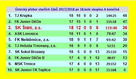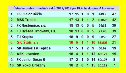 | 10. | SK Štětí, z.s. | 22 | 50:139 | 15 |