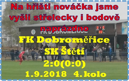 Začali jsme dobře, soupeře jsme napadali hluboko na jeho vlastní polovině a míč jsme moc často nepůjčovali. Domácí hra založená na obranných zkušenostech borců v zadní linii si ale věděla rady a trpělivě odolávala všem našim snahám. Převahu jsme měli, ale co to bylo platné, když mezi 3 tyče jsme se za prvních 45 minut trefili jen 1x. Hned na úvod 2. půle jsme inkasovali, to domácí nabudilo a naše snaha o vyrovnání se začala utápět v až příliš složitých kombinacích a střela přímo na branku byla jen jedna. V konečném součtu můžeme říci, že domácí vsadili na obranu s rychlými kontry a to slavilo úspěch. Naopak výkon našeho týmu můžeme ohodnotit slovy, že neměl svůj den. Za týden 8.9.2018 máme šanci to odčinit. Do Štětí přijede do tohoto kola dosud neporažený tým, který navíc ještě neinkasoval. FK SEKO Louny.