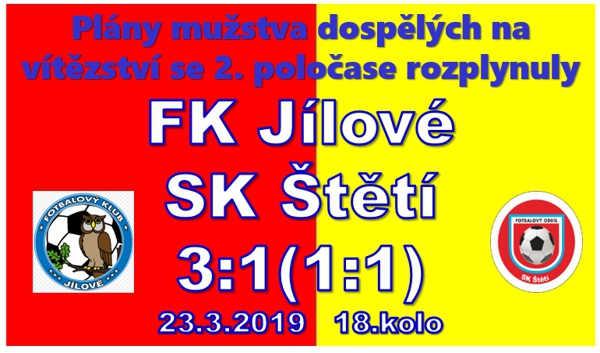 Na hřiště předposledního celku tabulky jsme zavítali téměř ve stoprocentním složení a úkol byl jasný. Přivést domů 3 body. Také hned v úvodních minutách jsme se nastěhovali na polovinu soupeře, ale Rudolfovi Slaničkovi utekl v posledním okamžiku balón a ani při dalším závalu před brankou jsme se v konečné fázi nedokázali prosadit. V 6. minutě jsme to zkusili střelou z velké dálky, ale brankář byl připraven. V 10. minutě jsme zahrávali první roh, ale ani v tomto případě se branka neurodila. Domácí jsme do ničeho nepouštěli a poprvé se před naši branku dostali v 11. minutě po volném přímém kopu, ale zastavil je praporek asistenta rozhodčího. Mával se ofsajd. Domácí zazlobili i v 15. minutě. Konkrétně Jiří Vosecký krásnou střelou přes celou šířku branky mířil nebezpečně a oddechli jsme si, když míč skončil vedle. Jinak to ale bylo naše mužstvo, které se snažilo režírovat hru. V 18. minutě jsme chtěli penaltu po zákroku na Marka Fausta, ale hlavní rozhodčí byl jiného názoru. Ve 22. minutě se střetl vybíhající brankář domácích Marek Smutný mimo pokutové území s Markem Faustem, který byl u míče dříve a byl z toho zákrok, že šel mráz po zádech. Po něm zůstal ležet včetně faulovaného i faulující brankář, který musel nakonec hřiště opustit. Nebylo to však kvůli červené kartě, tu dostal jen žlutou, ale kvůli zranění opustil hřiště na nosítkách. Domácí vůbec sahali často k nevybíravým zákrokům a jen samotný Marek Faust byl v 1. poločase asi 4x poslán k zemi způsobem, který volal po žluté. Těch domácí nakonec dostali za celý zápas 7, ale dohráli ho kompletní, i když ve 2. části měl rozhodčí druhou žlutou jednomu z nich ukázat. Přeci jenom byl na ně hodnější. Pojďme zpět do zápasu. Zahrávali jsme volný přímý kop a nejlépe se v šestnáctce soupeře zorientoval Tomáš Belák. Ve 26. minutě tak dostal naše mužstvo do vedení 1:0. Vypracovali jsme si i další šance na zvýšení náskoku. Zpětná přihrávka Písaře na Slaničku do ideální pozice skončila nepřesnou koncovkou. Kopali jsme i mnoho rohů, ale nic z toho. Ve 37. minutě proklouzl za obránce Belák, ale dostal se do hodně těžkého úhlu a míč do branky neprocpal. Když už jsme mysleli na přestávku, tak jsme dost bohorovně naložili s rozehrávkou, míč se dostal k nejlepšímu střelci domácích Jakubovi Píchoví, který už si dokázal poradit a srovnat gólem do šatny na 1:1. úvod druhého poločasu vypadal hezky. Centroval Faust a hlavičce Písaře moc nechybělo, abychom jsme šli znova do vedení. Místo toho ale v 52. minutě chyboval Jiří Vacek a stejně jako v 1. poločase trestal Jakub Pícha brankou na 2:1 pro Jílové. Dostali jsme se do složité situace. Když byl navíc v 57. minutě bez milosti poslán do šaten Petr Stejskal za zmaření zjevné brankové příležitosti, tak už hořelo na poplach. I v 10 jsme se sice snažili skóre srovnat, ale koncovka chyběla. Trestný kop zahrával Rudlof Slanička, ale domácí brankář jeho pokus zlikvidoval. V 66. minutě nezafungovala domluva obrany s brankářem, který při výběhu z branky zaváhal a domácí Jakub Kolář mohl slavit vedení 3:1. V 74. minutě mohl stejný hráč dokonce zvýšit už na 4:1, ale Tomáš Kysela stačil proti jeho střele úspěšně zasáhnout. To už se ale blížil konec. Štětští trenéři zkusili ještě prostřídat, ale na vyrovnání ani střelení branky to nestačilo. V 84. minutě kopal přímák Slanička, ale opět zasáhl brankář. Skóre se již neměnilo a s velkým smutkem jsme se domů vraceli s porážkou 3:1.