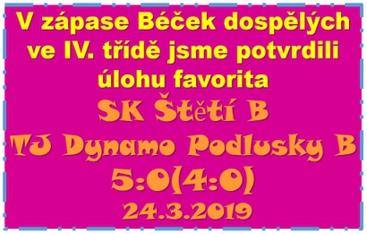 B mužstvo dospělých, vedoucí celek IV. Třídy dospělých po podzimní části, neprožilo zimu v nejlepším rozpoložení. Tréninků moc nebylo, a když už, tak chyběla větší účast. Trenér Václav Podhorský spolu s Pavlem Minárikem a vedoucím Václavem Švancarou počítali hráče a byli zvědavi, jak početný tým se dostaví k prvnímu jarnímu zápasu proti rezervě Podlusk. Veškeré obavy však vzaly za své, aspoň teda v prvním jarním zápase, protože přišlo 16 hráčů a to bylo určitě překvapení. Zahájili jsme celkem v poklidu, ale postupně jsme získávali převahu a šedesátka diváků čekala, kdo bude první letošním střelcem B týmu. V 5. minutě to z volného přímého kopu Filip Podhorský ještě nebyl, protože branku o metřík přestřelil. Neradoval se ani Koloman Horváth v 10. minutě, který levačkou prověřil hostujícího gólmana Jana Vaníka. Do třetice už to ve 12. minutě vyšlo. Matěj Svoboda zůstal po rohu bez dozoru a hlavou nedal hostujícímu brankáři šanci. 1:0 trvalo krátkou dobu. Za další 4 minuty poslal do běhu Filipa Podhorského Robert Feko a bylo to už 2:0. Další standardní situaci zužitkoval Dominik Beruška. Marné bylo volání brankáře hostů, jak je možné že nechávají při rohu zcela volného hráče hlavičkovat na 3:0. Fotbalové pohoda naší jedenáctky pokračovala ve 27. minutě. Druhou branku v zápase na 4:0 vstřelil Matěj Svoboda, když se hostujícímu gólmanovi zamotal míč nad hlavou a proklouzl do sítě. Ve 37. minutě bylbrankový rozlet týmu Štětí zastaven, když po druhé žluté kartě musel hřiště opustit Koloman Horváth. I v deseti jsme mohli v poslední minutě první půle náskok ještě navýšit. Šanci měl Podhorský, ale brankář se stačil přemístit k pravé tyči, kam Filip mířil. Druhý poločas už tak zajímavý divácky nebyl. Hned ve 48. minutě sice hezky vystřelil Dominik Beruška, ale brankář vyrazil na roh. Pak jsme se na dlouhou dobu odmlčeli. Až v 65. minutě po volném přímém kopu měl gól na noze Beruška, ale přímo z první branku přestřelil. V 75. minutě se připomněli i hosté. Střídající Marek Vilánek se opřel do míče a nebylo to vůbec špatné. Balón jen těsně minul cíl. Hosté o pár minut později vyprodukovali před naší brankou další nepříjemné chvíle. Zachránili jsme za cenu rohu. První branku druhého poločasu mohl vstřelit Dominik Beruška. Kopal totiž penaltu. Moc mu nepovedla a pochvalu zaslouží brankář, který míč vyrazil na roh. Po jeho provedení jsme se ale přeci jen radovali, protože střídající Jakub Tichý poslal pod tělem brankáře míč do branky na 5:0. A protože v 82. minutě hlavičkoval Dominik Beruška jen do tyče, tak to také 5:0 skončilo. Výhra vysoká, zasloužená, která mohla být i vyšší nebýt vyloučení ještě v prvním poločase