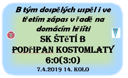 Třetí zápas B mužstva dospělých na domácím trávníku v řadě za sebou a také cíl potřetí vyhrát. V brance se po týdnu opět představil Jiří Vokoun, ale jak se později ukázalo moc práce neměl, i když jeho dlouhé nákopy několikrát vyzvaly spoluhráče k zakončení. Hosté nastoupili pouze v 10 a od úvodního zapískání se hra přesunula na jejich polovinu. První šance, kterou jsme také hned využili, se narodila ve 12. minutě, když Lukáš Brzek našel před brankou Jakuba Tichého, který svojí premiérovou brankou v dresu Štětí zajistil našemu mužstvu vedení 1:0. Další premiéra se konal v 16. minutě a představil se v ní Václav Guzy, který střelou zpoza šestnáctky překvapil hostujícího brankáře a dal také svoji první branku ve štětstkém trikotu. Měli jsme i další možnosti skóre navýšit. Pavel Minárik se ligově uvolnil a střele chyběl pověstný kousek, aby míč zaplul do sítě. Vstřelení branky se nabízelo i Josefovi Horáčkovi ve 24. minutě, ale vystřelil příliš ukvapeně a brzy. Míč se brance zdaleka vyhnul. Vynahradil si to ve 27. minutě, když se nezadržitelně prohnal hostující obranou a s velkým přehledem upravil na 3:0. Třetí branka definitivně rozhodla o osudu zápasu a ještě v prvním poločase mohly padat góly další. Petra Fulína věkem ještě dorostence při jeho úniku po pravé straně nikdo nezastavil a dokázal i nabít nabíhajícímu Filipovi Podhorskému, který z hranice desítka na stadionu ve Štětí hodně přisvítil a branku překopl. Sporadická snaha soupeře ohrozit naši branku přišla na řadu ve 34. minutě z volného přímého kopu, ale žádný poplach z toho nebyl. Na profesorsky zahraný roh Filipem Podhorským si naskočil Pepik Horáček, ale hlavičku přesnou neměl. V tuto dobu už se několikrát dobrým zákrokem předvedl i hostující brankář Václav Materna a předvedl to i ve 42. minutě po střele Podhorského. Druhý poločas jsme načali velkou šancí. Už se zdálo, žeJakub Tichý dostane míč za brankovou čáru i s brankářem, ale nakonec oba zůstaly před. V 51. minutě předvedl fotbalovou ekvilibristiku Tomáš Danč, který prokličkoval přes několik obránců a připravil gól do prázdné branky na 4:0 pro Pavla Minárika. Samotný Tomáš Danč se do listiny střelců brankou na 5:0 zapsal krásným dloubákem v 58. minutě. Když v 59. minutě přidal pod padajícím brankářem branku na 6:0 Filip Podhorský, tak se zdálo, že místní ukazatel skóre nebude stačit. Skutečnost, ale byla úplně jiná. S dalšími brankami byl konec. Naopak v 64. minutě chybnou rozehrávkou zavařil málem vlastnímu brankáři Josef Horáček, ale naštěstí se to obešlo bez katastrofy. Zbytek utkání už žádné zajímavé fotbalové chvilky nepřinesl, až teda na střelu Filipa Podhorského v 78. minutě, která skončila na břevně. Utkání mělo očekávaný průběh a vítězství potvrdilo naši jarní neporazitelnost. Za týden v neděli 14. dubna jedeme do Přestavlk , kde se už ve 14:00 střetneme s místním celkem.