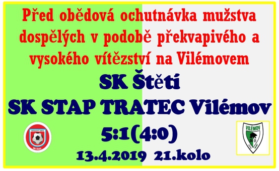 Vysoké vítězství 5:1 proti silnému týmu z Vilémova nejenom překvapilo, ale hlavně potěšilo všechny příznivce štětského týmu. Vyšel úvod utkání a to co jsme v minulém kole zahodili v Lounech, jsme vybalili v dnešním úvodu utkání a ve 23. minutě vedli už 3:0. Smrtící útoky dělali hostům velké starosti a kapitulovat stačili ještě 2 minuty před koncem z kopačky Jakuba Slavíčka, i když si hosté po zápase ztěžovali, že dvěma gólům předcházel faul na jejich hráče. Druhá půle už tak bohatá na branky nebyla. Šancí sice bylo dost na obou stranách, ale zapsáním do listiny střelců skončily jen 2. Rudolfa Slaničky na 5:0 a korelce výsledku Miloslava Kučery na 5:1. Zápas se domácímu publiku líbil a hráči zaslouží za předvedený výkon pochvalu