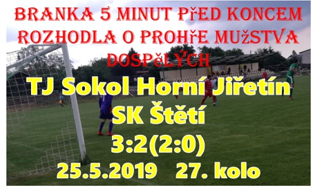 Jednu změnu museli trenéři udělat oproti minulému úspěšnému zápasu proti Litoměřické rezervě, když opětovně zraněného Pavla Faryho nahradil Jan Prieložný. Domácí potřebovali body jako sůl, protože ve spodku tabulky je situace hodně zamotaná a Horní Jiřetín po výsledkově neúspěšných posledních kolech se také zařadil mezi mužstva hrající o záchranu v soutěži. V úvodních 10 minutách se toho na hřišti moc neodehrálo a hrstka věrných diváků se nudila. Přerušili to domácí ve 12. minutě. Ve středu hřiště jsme přišli o míč, obrana se nestačila včas dostat do obranného postavení a Tomáš Banovič otevřel skóre na1:0. Ve 14. minutě se pro domácí nabízela další příležitost po volném přímém kopu, ale míč z nohy Antonína Fišera skončil v Krušnohorských lesích. Ve hře dopředu jsme se moc neprosazovali. Až teprve v 15. minutě a byl to obránce Jiří Vacek, kdo v naší sestavě zkusil vystřelit. Úspěšně jsme nezahráli ani náš první roh z kopačky Jiřího Vokouna v 17. minutě. Ve 21. minutě jsme nechali volný prostor před pokutovým územím a toho náležitě využil Jakub Ševčík na zvýšení náskoku na 2:0 pro Jiřetín. Domácí byli na koni a naopak naše mužstvo zcela mimo rytmus. Chyběla kombinace, na domácího brankáře jsme prakticky nevystřelili a nepřesná rozehrávka zakládala spíše k rychlým protiútokům domácích. Jako třeba ve 29. minutě, kdy jsme uspořádali den otevřených dveří a zachraňovat pět minut po dvanácté, musel Tomáš Kysela hlídající branku. Na začátku poslední třetiny prvního poločasu jsme zahrávali volný přímý kop v podání Jiřího Vokouna, ale přeci jenom to bylo až příliš daleko na to, aby to dopadlo lépe. Poprvé v zápase museli domácí vyhlásit větší pohotovost až ve 37. minutě. Postaral se o to Marek Faust, ale v tísni už nestačil přihrát přesněji na Tomáše Písaře. 2 minuty před přestávkou z dobrých 22 metrů vypálil Marek Faust a domácí gólman Miloslav Aschenbrenner se zaposlouchal do symfonie, kterou mu nad hlavou zahrálo břevno. První půle byla z naší strany hodně špatná a reakce přišla v podobě dvojího střídání, i když Jakub Slavíček odešel kvůli zdravotním potížím. První šanci a příležitost navýšit výsledek ve 2. poločase ale měli domácí. S velkou lehkostí prošli naší obranou a ještě, že nedokázali lépe zamířit. Pak už jsme se konečně dočkali i my. V 60. minutě přišla chvíle Marka Fausta, který se dokázal dostat v rychlém běhu za obránce a přesnou střelou snížil na 1:2. Za další 2 minuty už bylo dokonce vyrovnáno na 2:2. Jiří Vokoun kopal volný přímý kop, brankář s velkým úsilím tečoval míč na břevno a odrážený ho hlavou do sítě poslal Tomáš Písař. Domácí byli zaskočeni a nabízela se možnost zápas v náš prospěch otočit úplně. Když pak ještě v 74. minutě musel hřiště po zbytečných řečech opustit domácí Antonín Fišer, tak se zdálo, že se to možná i povede. Výhodu jednoho muže v poli jsme ale nějak viditelně využít nedokázali. Až zbytečně moc jsme hráli ze zajištěné obrany, a i tak nám domácí párkrát zazlobili, a žádnou větší převahu jsme nezískali. 2 dobré střelecké příležitosti jsme ale měli. V 76. minutě prošel přes všechno, co stalo v cestě Jiří Vokoun, ale tu poslední překážku, kterou byl domácí brankář už zdolat nedokázal. V 80. minutě jsme postupovali 3 na 2 obránce, aby nakonec vystřelil Marek Faust, ale branku minul. Vzápětí měli šanci pro změnu zase domácí, ale i v tomto případě byla muška vychýlená. No a pak to přišlo. Ve středu hřiště byl přistrčen Marek Faust, místo toho, abychom hráli, tak jsme čekali, že hlavní rozhodčí Dominik Průša odpíská faul, nestalo se tak a než jsme se stačili vzpamatovat, tak Stanislav Flemmr získal domácím vedení 3:2. Zamrzí to, protože gólu předcházela situace, kterou měl hlavní rozhodčí Dominik Průša pískat. Bohužel se tak nestalo a my si můžeme s trochou nostalgie jen tak zavzpomínat na 1. kolo tohoto ročníku, kdy jsme doma prohráli s Lovosicemi 1:0 a branka padla podobně jako ta dnešní rozhodující a utkání řídil stejný arbitr. Tím ale zdaleka nesvádíme porážku na rozhodčího. Výkon dnes dobrý nebyl a prohráli jsme si to sami předvedenou hrou. Čas ani sílu na vyrovnání už jsme nenašli. Po 2 venkovních utkáních hrajeme příště 1. června 2019 v 10:15 doma proti FK Tatran Kadaň.