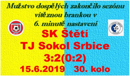 Před týdnem jsme v Krupce v poločase vedli 1:0 a nic nenasvědčovalo tomu, že bychom měli přijet domů s prázdnou. Z druhé půle se ale stala noční můra a domů jsme odjeli s debaklem 1:4. Kromě toho jsme také přišli o 4. místo. V posledním kole letošního roku jsme narazili na 2. celek tabulky, a pokud jsme se na 4. pozici chtěli vrátit, tak to chtělo vyhrát a sledovat, jak si Krupka povede v Horním Jiřetíně. První půlka prvního poločasu nám ale vůbec nevyšla. Kopali jsme sice jako první roh, ale ten byl více poznávací než nebezpečný. To hosté byli více ve hře. Z dálky to zkusil jejich kapitán Karel Jelen, ale brankovou konstrukci minul a 12. minutě zase v dobrém postavení neudržel stabilitu na nohách Pavel Kordule a balón mu utekl. Dobré oči měl David Mencl v naší sestavě, když si vyhlédl nabíhajícího Jakuba Slavíčka, ale tomu míč proklouzl pod nohama. Výsledek 0:1 se na ukazateli skóre rozsvítil v 17. minutě. Běžecký náskok na Kolomana Horvátha získal Pavel Kordule a střelou k bližší tyči slavil úspěch. Změnit nepříznivý vývoj skóre chtěl Rudolf Slanička z volného přímého kopu, ale trefil jen dobře postavenou zeď. Ve 22. minutě volil Jiří Ransdorf až příliš riskantní přihrávku, která znamenala okamžitý výpad do naší rozhozené obrany a střelu Davida Betelky přes celou branku na 2:0. Vývoj, se kterým počítal asi málokdo. Na druhou stranu to byl relativně začátek zápasu a nebylo ještě nic ztraceno. Chtělo to ale zlepšit výkon a to se nám bohužel minimálně v 1. poločase moc nedařilo. Srbice mohly dokonce ještě svůj náskok pojistit, ale Tomáš Kysela střelu Davida Batelky z volného přímého kopu dokázal ve 27. minutě vytěsnit na roh. Nedařily se nám ani standardní situace a na první, i když hodně velkou šanci jsme čekali do 42. minuty. Koloman Horváth prolétl hostující obranou, ale trefil jen stojnou nohu Zdeňka Diveckého strážícího hostující svatyni. Tutovku měl na kopačky ve 44. minutě i Rudolf Slanička, ale ani on míč mezi 3 tyče podél brankáře procpat nedokázal. O přestávce vládla mezi fanoušky Štětí ponurá nálada. Fotbal to z naší strany pohledný nebyl, ale i tak se stále věřilo, že by změna mohla přijít. Začátek 2. poločasu tomu také nasvědčoval. Vokoun zahrával volný přímý kop, ale trefil jen prvního stojícího protihráče, pak zase ve 48. minutě ztroskotal na brankáři hostů Jakub Slavíček a do třetice to zkusil z poměrně velké dálky Jiří Vokoun, ale branku minul. Zpátky do hry o body jsme se vrátili v 54. minutě. Já na Slaničku, Slanička na mě, tak to probíhalo, než Jiří Vokoun snížil na 1:2. Ožili jsme a za další minutu mohl střídající Tomáš Písař dokonce vyrovnat, ale Zdeněk Divecký v brance se střelou pod nohy překvapit nenechal. Hosté měli možnost kontrolovat průběh utkání volným přímým kopem, ale střela bylo hodně slabá a Tomáš Kysela větší starosti neměl. Naopak, že i levou to Jiří Vokoun umí, předvedl v 67. minutě, ale brankář hostů byl opět oporou hostujícího celku. Stále jsme se snažili tlačit na pilu a pokoušeli se o vyrovnání. Slanička z velké dálky v 70. minutě vystřelil ještě vedle, ale v 72. minutě už naše lavička explodovala. Jiří Ransdorf krásnou střelou vyrovnal na 2:2 a o další krůček jsme se přiblížili k obratu v zápase. Dokonat to mohl o minutu později Marek Faust, ale trefil jen brankáře. Gól po centru Davida Mencla měl na hlavě Tomáš Písař, ale branku netrefil. V 85. minutě zahrávaly Srbice rohový kop, ale byl z toho nakonec rychlý protiútok naší jedenáctky zakončený střelou Marka Fausta a úspěšným zákrokem brankáře. Ve 2. minutě nastavení se do úniku dostal Marek Faust, zezadu byl hodně nevybíravým způsobem poslán k zemi Michalem Khaurem. Ten po zásluze vyfasoval červenou kartu, ale Marek bohužel už nedohrál.. Volný přímý kop si vzal na starost Jiří Vokoun a přesně v hodině dvanácté zajistil našemu týmu střelou přes zeď vítězství 3:2. A protože Krupka v Horním Jiřetíně prohrála, tak nám patří konečné 4. místo v Ústeckém přeboru.