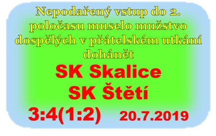Po týdnu jsme opět zamířili do Libereckého kraje, kde nás ve Skalici čekal proti účastníkovi přeboru druhý letní přípravný zápas. Skupina stejně jako před týdnem jsme byli početná a podobný byli úvod zápasu, který jsme zahájili aktivně a už ve 4. minutě se nám ho také podařilo okořenit brankou. Vokoun poslal z volného přímého kopu balón před branku, který se tam tak nějak divně odrazil od brankáře a Jiři Neuman už to neměl až tak těžké, aby ho dopravil do branky a otevřel skóre na 1:0. I nadále jsme byli pohyblivějším mužstvem, snažili se soupeře důsledně napadat a útočníky posílat do rychlých výpadů. V 19. minutě to bylo odměněno brankou na 2:0. Jiří Vokoun vyzval Kolomana Horvátha a ten takovéto příležitosti dokáže využívat. 2:0 bylo na úvod příjemných a zdálo se, že náš komplikace nečekají. Domácí kopali roh, ale byl až moc dlouhý a žádné větší nebezpečí pro nás z toho nebylo. Slibnou příležitost měl na druhé straně ve 29. minutě Jakub Pícha, ale jeho obávaná levačka trefila jen brankáře. Zahrávali jsme i volný přímý kop těsně z hranice vápna, i když ne zrovna z dobrého úhlu, ale i tak Jakub Pícha zkoušel střelou k bližší tyči překvapit domácího brankáře, který však střelu vyrazil. Postupně se z naší hry začala vytrácet pohoda, domácí se začali dostávat do tempa a po založení akce ve 38. minutě a velké šanci se dopracovali k rohu, po jehož rozehrání jsme zůstali, jak přimražení a domácí se hezkou střelou do šibenice podařilo snížit na 1:2. Byl to také poločasový výsledek a do druhé části jsme vyběhli s velkými změnami v sestavě. Na hře se to projevilo až velmi rychle. Chyba v rozehrávce hned ve 48. minutě a trest v podobě gólu na 2:2 byl na světě. I nadále jsme se hledali a v 52. minutě jeden z hráčů domácích prošel přes 4 bránící hráče a střelou pod vingl nedal Tomášovi Kyselovi mezi 3 tyčemi šanci. Z vedení 2:0 jsme prohrávali 3:2. Ještě, že se domácí hned o minutu později dopustili hrubky a David Mrázek toho dokázal využít ke srovnání výsledku na 3:3. V dalších minutách jsme se pokoušeli zařadit vyšší rychlostní stupeň, ale dostat se do toho správného tempa se nám nepodařilo. I tak ale šance byly. Nejprve Vokoun, ale jeho úmysl skórovat překazil včasným vyběhnutím brankář. V 66. minutě byl brankářem nedovoleně v pokutovém území zastaven Jiří Neuman a na řadu přišla penalta. Kdy jí naposledy Jiří Vokoun nedal, nevíme, ale po dnešku je to datum 20.7.2019. Brankář Pavel Blažek, který má otcovské brankářské kořeny ve Štětí, směr míče vystihl a za svá záda nepustil. Jirka se s tím ale nesmířil, v 77. minutě vypálil, brankář vyrazil jen před sebe a právě dobíhající Jirka hezkým dloubákem zajistil vedení našemu týmu 4:3. Ve zbytku utkání už se toho moc nestalo. Kopaly se rohy na obou stranách, ale nic z toho.
