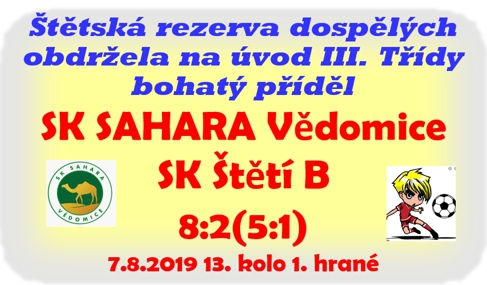 Úvodní vystoupení B mužstva dospělých jako nováčka III. Třídy bylo na programu ve Vědomicích v hezkém fotbalovém prostředí, kde má svůj stánek místní klub SAHARA. Jak se bude utkání vyvíjet a které mužstvo bude mít navrch bylo, jak už to před 1. kolem soutěží bývá tajenkou a byli jsme zvědavi, jak se naše mužstvo ve vyšší soutěži uvede. Letní příprava nebyla zrovna ukázková, na druhou stranu jsme odjeli se 3 hráči, kteří jsou na soupisce A mužstva. Jen co hlavní rozhodčí zkušený Miroslav Horáček poprvé písknul, tak se začal směrem na naší branku valit jeden smrtící útok za druhým. Obranná činnost neexistovala a tak když během prvních 8 minut postupovaly Vědomice hned 3x úplně sami na naši branku a pokaždé cíl minuly, tak to vypadalo, jakoby nad nám držel ochrannou ruku fotbalový pánbůh. Potvrdila to vzápětí i 10. minuta, kdy se šikovně v pokutovém území domácích uvolnil Filip Podhorský a do vedení 1:0 šlo naopak naše mužstvo. Kdo by se domníval, že teď už to bude dobré, v obraně se srovnáme a utkání dostaneme pod kontrolu, tak byl během minuty vyveden z omylu a po gólu Davida Bláži to bylo 1:1. Neuběhlo ani 5 minut a obrana opět připomínala cedník, kterým snadno proklouzl Dominik Špicar a zavěsil na 2:1. V 18. minutě dokončil dokonalý obrat v zápase gólem na 3:1 Jan Chládek. Domácí převzali otěže zápasu do svých rukou a najít protizbraň se nám nedařilo. Určitou naději ještě v 1. poločase na obrat jsme dostali po faulu na Dominika Berušku a nařízené penaltě. Ujal se ji Luboš Uřídil, ale místo brankové sklizně z toho byla úroda kaštanová ze stromů za brankou. Slovo si tak v první pětačtyřiceti minutovce vzali domácí. Nejprve Jan Chládek upravil na 4:1 a pak si ještě přidal vlastní gól na 5:1 Tomáš Danč. Moc příjemnou přestávku jsme neprožívali. Čtyřbrankové manko už šanci na zisk nějakého toho bodu nedávalo. V 52. minutě jsme ale i tak měli ještě příležitost korigovat a také jsme ji využili. Kopali jsme penaltu, tu si vzal tentokrát na starost Filip Podhorský a snížil na 2:5. To bylo ale z naší strany po změně stran všechno. V 56. minutě přinesl další uklidnění do domácích řad Michal Štulc v podobě gólu na 6:2. Domácí koncertovali, předváděli krásnou kombinační hru, která z naší obrany dělala přihlížející. Vědomice se dostávaly do obrovských šancí, ale to co zahazovaly bylo k neuvěření. To se musí vidět. Během jedné akce nastřely 2x tyč a jednou břevnu. Tyčky trefily i při dalších kontrech. Navíc mnohokrát ze slibných střeleckých příležitostí mířily mimo a to co šlo mezi tyče tak zázračně pochytal Josef Horáček v brance, jehož výkon se zaslouží jedničku s hvězdičkou. Spolu s ním lze v našich řadách pochválit ještě Petra Fulína, který bojoval a mnohokrát zachraňoval před hrozícím nebezpečím. Ale i tak jsme museli do konce utkání míč ze sítě ještě 3x vytahovat. O branky se postarali Michal Štulc, Dominik Špicar a Petr Vlček.
