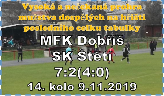 Na hřiště posledního celku tabulky, který v předchozích 13 kolech posbíral 8 bodů, jsme jeli pro body. Do zápasu už nastoupili zranění Jiří Vokoun a David Brandejs. Naopak oproti minulému zápasu doma zůstali zraněný Jiří Neuman a pracovními povinnostmi zatížený Tomáš Belák. V úvodních minutách to vypadalo, že určovat na jaké polovině hřiště se bude hrát, bude na našich, ale opravdu to bylo jen v úvodu. V 1. minutě kopal roh Jakub Pícha a stejnou výhodu jsme měli i v 8. minutě. A právě po 2. rohu měl na hlavě gól Adam Brůža, který se ale zalekl a balón netrefil. Pak už do hry vstoupila domácí Dobříš. Odskok míč pod dlouhém nákopu špatně odhadl Jiří Ransdorf a než se stačil otočit, tak si za ním míč navedl k zakončení Štěpán Maryška a zajistil domácím vedení 1:0. V 16. minutě udeřili domácí podruhé. Po nedůrazné hře ve středu hřiště jsme přišli o míč, Štěpán Maryška si povodil obranu a naservíroval balón Janu Šrainovi na gól na 2:0. Ve 21. minutě jsme si opět nevěděli rady se Štěpánem Maryškou. Jen úspěšný zákrok Martina Jelínka zabránil dalšímu úspěchu domácích. Poučení to ale do naší obranné činnosti nepřineslo. Hned za 3 minuty poslal totiž od rohového praporku míč před branku Václav Šrain, našel tam nikým nehlídaného jmenovce Jana a svojí druhou brankou v utkání zvýšil na 3:0. Takovýto průběh utkání určitě neočekával ani ten největší pesimista. V dalším průběhu 1. půle jsme 2x zazlobili. Nejdříve to byla tečovaná střela Víti Kaly, po které brankář vyrazil míč na roh a pak únik Jiřího Vokouna, který hledal před brankou nabíhajícího Jakuba Slavíčka, ale míč k němu nedošel. Ve 34. minutě se na naší branku po levé straně řítil Štěpán Maryška, ale branku překopnu. Ve 37. minutě ho nahradil Patrik Junek. Sám opuštěn zůstal před naší brankou a stačilo jen nastavit nohu. 4:0 a pomalu se začínal rýsovat výsledek v podobě debaklu. Ještě před změnou stran to mohl malinko vylepšit David Brandejs. Míč tlačil k pravé tyči i očima, ale brankář v posledním možném okamžiku vytlačil na roh. V kabině si o přestávce hráči chválu nevyslechli. Hned po minutě hry ve 2. části byl blízko snížení náskoku domácích David Brandejs. Míč uklízel k levé tyči, ale byli tam i rukavice Radima Webera. Štěpán Maryška, o tom se hráčům Štětí bude asi dlouho zdát. V 50. minutě si zasekl míč v našem vápně, ale nohu mu zasekl i Jiří Ransdorf a to nemohlo být nic jiného než penalta, kterou s přehledem gólem na 5:0 zužitkoval Patrik Junek. Kde byli naši obránci v 54. minutě? Každopádně nebyli tam, kde být měli a postavili do lehké úlohy Patrika Junka, který po centru Adama Petrlíka zvýšil na drtivých 6:0. Když pak o minutě postupoval sám na brankáře domácích Jakub Slavíček a nedal, tak ozývalo „ Je to na ručník“. Z dobré pozice zahrával volný přímý kop Jakub Pícha v 56. minutě, ale vysoko přestřelil. Trestňák kopali i domácí a hlavička, která z toho vzešla, šla jen těsně vedle. V 61. minutě nahradil Jakuba Píchu, který neměl fit kotník, Lukáš Jakl a byl to on, kde po minutě pobytu na hřiště z osmi metrů ve velké šancí branku vysoko minul. Že by to mohlo jít, ukázala nahrávka David Brandejse za obranu na Jiřího Vokouna v 64. minutě a jeho nechytatelná střela, kterou nestačila zachytit ani místní kamera, znamenala snížení náskoku na 1:6. V 68. minutě nás potkala další nepříjemná věc. Vlastně hned 2 najednou. Centr před branku, střelu Štěpána Maryšky Martin Jelínek v brance nohou vyrazil, ale pouze k Patrikovi Junkovi, který gólem na 7:1 málem protrhl síť. Ale to v bolestech ležel před brankou Martin jelínek, držel se za koleno a musel střídat. Mezi 3 tyče nastoupil Václav Sailer, který nebyl také úplně fit. V 74. minutě zkoušel střeleckou mušku z volného přímého kopu Jiří Vokoun, ale náboj přesný neměl. Částečně s ohledem na vývoj utkání si to vynahradil v 85. minutě, Jakub Slavíček směřoval míč na Davida Brandejse, ten ho prozřetelně nechal proběhnout za sebe, kde byl právě nabíhající Jiří Vokoun a snížil na konečných 2:7 z našeho pohledu.