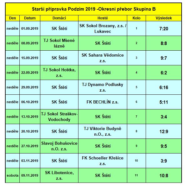 První podzimní mistrovské utkání sehrál tým s Brozany 1. 9. 2019 na vlastním hřišti. Hostující tým byl na tom herně lépe a jednoznačně vyhrál 20:7. Ve 2. kole jsme zavítali do Mšených Lázních, kde jsme po remíze 8:8 vybojovali první bod v soutěži. První výhry v soutěži jsme se dočkali 15. 9. 2019 doma v zápase se Saharou Vědomice, i když to nebyl vůbec jednoduchý zápas a výsledek 9:7 to jenom dokazuje. Po 3. kolech z toho bylo 6. místo se 4 body. Derby jsme si zahráli 22. 9. 2019 v nedaleké Hoštce s místním Sokolem, který do tohoto zápasu nezískal ještě ani bod. Po jeho skončení už to ale neplatilo. Vyhořeli jsme na celé čáře a po vyplnění zápisu veteránem mezi rozhodčím Antonínem Andrlem letěla do světa zpráva, že jsme prohráli 6:2. V dalším utkání doma v 5. kole s Dynamem Podlusky jsme ještě v poločase drželi krok a prohrávali jen v uvozovkách 7:4. Po změně stran soupeř zabral a byla z toho porážka o 10 branek. 16:6. 6. října jsme hráli po týdnu opět doma. Střetli jsme se FK Bechlín. Snažili jsme se uhrát co nejlepší výsledek, ale už v poločase jsme prohrávali 5:3 a ve 2. části soupeř svůj náskok ještě navýšil na konečných 11:5. Po 6 odehraných kolech nám patřilo 9. místo se skórem 37:68. Na lepší časy nám zasvítilo 13. 10. 2019 ve Straškově, kde jsme po dramatickém utkání vyhráli tím nejtěsnější rozdílem 4:3, když v poločase jsme prohrávali 3:2. 20. října bylo na programu 8. kolo a v něm jsme se doma dočkali druhé výhry v řadě. Porazili jsme Viktorii Budyni nad Ohří 12:9. 5 branek vstřelil Jakub Woska a 4 kapitán mužstva Vojtěch Vencálek. Před námi byly ještě 3 podzimní kola, která měla rozhodnout, zda se nám podaří postoupit do jarní skupiny ELITE. Zatím jsme byli 6. místě a to by značilo úspěch. Hned v dalším 9. kole 27. 10 .2019 jsme však v důležitém utkání s jedním z konkurentů v boji o postup, Slavojem Bohušovice na jeho hřišti prohráli 9:5. Když jsme pak první listopadový víkend neuspěli doma ani proti Křešicím a prohráli 9:3, bylo jasné, že z postupu radovat nebudeme. Rozlučkou s podzimem byl venkovní zápas v Libotenicích 9. 11. 2019, kde jsme prohráli 10:8.