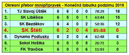 | 6. | SK Štětí, z.s. | 7 | 106:105 | 6 |
