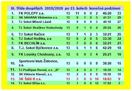 V podzimní tabulce nám patřilo 13 místo s 9 body a hrozivým skóre 18:63. Největší slabinou byla zápasová docházka, kdy se do poslední chvíle nevědělo, v kolika se na zápas pojede. Na jaře nás čekal boj o záchranu a nezbývalo nic jiného, že věřit, že všichni hráči si uvědomí, že je třeba trochu jiný přístup, pokud se má III. Třída ve Štětí zachránit. V zimě se zdálo, že se něco změnilo. Odehrálo se 5 přátelských zápasů, z nichž 2 vítězně a 3x se prohrálo. I na tréninky se docházelo ve vyhovujícím počtu. Pak však přišel COVID 19 a byl konec. Nikdo nesestupuje ani nepostupuje. B mužstvu přejeme, aby chuť do hry, kterou mělo v zimě, je v létě neopustila.