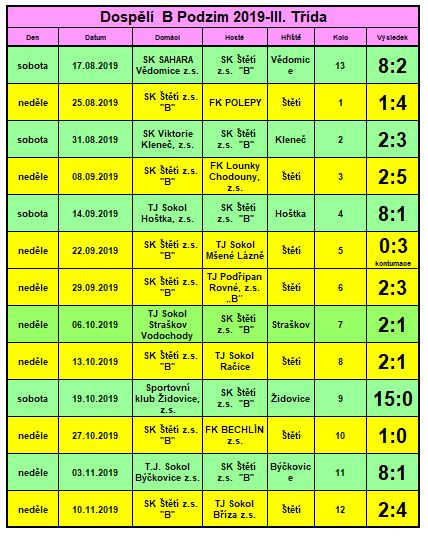 Po znovu založení B mužstva dospělých v roce 2018 se hned prvním rokem podařilo postoupit do III. Třídy. Soutěž, která se po reorganizaci soutěží na úrovni kraje stala kvalitnější. Potvrdilo se to hned v 1. kole 17. 8. 2019, kdy jsme si z Vědomic přivezli nadílku v podobě porážky 8:2. Ve 2. kole 25. 8.2019 jsme si doma vyzkoušeli Polepy a i když jsme s favoritem dlouho drželi krok, tak jsme nakonec prohráli 4:1. Až teprve ve 3. kole poslední srpnový den 31. 8. 2019 se na nás usmálo sluníčko a z Klenče jsme si přivezli 3 body po výhře 3:2, když jsme se strachovali až do úplného konce včetně nastavených minut rozhodčím ing. Doškem. Přišlo dalších 5 zápasů a v nich 5 porážek, mezi kterými byla i jedna kontumace. Do utkání s dvoubodovými Lounky jsme vstupovali 8. 9. 2019 na domácím pažitu sebevědomě. V poločase jsme vedli 2:1 a kráčeli k výhře. Fotbal se však hraje 90. minut a ve 2. poločase jsme dopadli jak Titanic. Prohráli jsme 5:2. Téměř vyprodaný byl stadion TJ Sokol Hoštka o týden později 14. 9. 2019, kde nás v 5. zápase čekalo derby. Domů jsme si ale bohužel odvezli pěkný ranec. Hoštka v létě posilovala a v sestavě se objevilo hodně štětských odchovanců, kteří se také střelecky prosadili. Jen Jakub Peterka nám v 1. poločase vstřelil 4 branky. Poločas 6:1 a 2. část už se jen dohrávalo a byla z toho porážka 8:1. V tabulce nám patřilo předposlední 13. místo. O týden 22. 9. 2019 později jsme si uřízli pěknou ostudu. V neděli dopoledne jsme se doma nesešli proti Mšeným Lázním a byla z toho kontumace 3:0 a pokuta k tomu. To už jsme přestávali být strašákem soupeřů a do Štětí přijeli 29. 9. 2020 hráči Podřipanu Rovné B. Opět se nám nedařilo, a i když Luboš Uřídil vstřelil 2 branky, tak jsme prohráli 3:2. Blízko druhého úspěchu jsme byli 6. 10. 2019 ve Straškově. Po gólu Filipa Podhorského jsme ještě v 77. minutě vedli 1:0. Nejprve ale Pavel Čučka vyrovnal na 1:1 a v 87. minutě Martin Čučka zajistil domácím vítězství 2:1. V tabulce jsme se 3 body zůstávali na 13. místě. K 9. zápasu sezóny se 13. 10. 2019 do Štětí dopravili přátelé ze Sokolu Račice a po předchozích výsledcích obou mužstev se jim také více věřilo. Premiérový gól v našem dresu vstřelil v 1. poločase Michal Černý a za stavu 1:0 se šlo do kabin. Hned na úvod 2. části se měnilo skóre. Nejprve Filip Podhorský 2:0 a o pár minut později Miloš Vála 1:2. Pak to bylo až do konce velké drama, ale ze středového kruhu už se nerozehrávalo ani jednou. Doufali jsme, že výhra přinese do našich řad chuť do dalších utkání, ale vystřízlivěli jsme velmi rychle. Hned v následujícím kole jsme se nesešli proti Židovicím a v 7 lidech jsme dostali 19. 10. 2019 nakládačku 15:0. Pak následovalo 26. 10. 2019 domácí utkání proti Bechlínu, ve kterém jsme si vybrali velkou porci štěstí, když za stavu 1:0 pro naše mužstvo v 93. minutě trefili hosté tyčku. Jak se střílí branky, musel ukázat a jedinou branku do sítě Bechlína vstřelil hrající trenér Pavel Minárik senior. 2. kola před koncem podzimu jsme měli 9 bodů a to nestačilo na lepší než 13. místo. Do podhůří Českého středohoří do Býčkovic jsme jeli první listopadovou neděli 2. 11. 2019. Jak se již na podzim stalo zvykem, tak opět byl problém s docházkou a podle toho také výsledek vypadal. Prohráli jsme 8:1. V posledním podzimním kole 10. 11. 2019 jsme doma přivítali poslední celek tabulky Břízu, která ještě nezískala bod, a i když naše výsledky v první polovině soutěže nebyly růžové, tak se očekávala naše výhra. Světe div se, my jsme prohráli 4:2. Špatný výkon bez pořádné střely na branku.