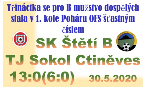 B mužstvo nehodlá zahálet až do příští sezóny a také využilo nabídky zahrát si v červnu Turnaj o pohár OFS 2019/2020. Změřit síly v 1. kole turnaje přijel do Štětí účastník IV. Třídy TJ Sokol Ctiněves. Z tohoto pohledu bylo naše III. třídní mužstvo mírným favoritem, ale úvodní minuty nenasvědčovaly, že by měl zápas nakonec takový průběh, který z toho byl. V úvodu zápasu dělal hostující obraně největší starosti Marek Zoubek. Největší možnost měl v 10. minutě, ale brankář byl nakonec u míče dříve. Jinak se ale hrálo od vápna k vápnu a na první opravdu velkou příležitost se čekalo až do 15. minuty, V té jsme zahrávali volný přímý kop z pravé strany a na zadní tyčí číhající Dominik beruška se parádně pověsil do vzduchu a hlavou dostal Štětí do vedení 1:0. Vedoucí gól byl pro naše mužstvo signálem k dalšímu zvýšení herní aktivitu a na hřišti už pomalu začínala kralovat naše jedenáctka. Daniel Lisec v 18. minutě zleva krásně odcentroval na Luboše Uřidila, který se ale dostal až na příliš velký kontakt s gólmanem a šanci nevyužil. Ve 21. minutě měl svojí druhou velkou šanci Marek Zoubek, ale ruce na d hlavu nezvedal. Skóre na 2:0 se měnilo ve 25. minutě, když ještě první střela Luboše Uřídila v brance neskončila, ale z dorážky už Daniel Lisec uspěl. Ve 27. minutě se do listiny střelců po krásném centru od Daniela Lisce dostal Luboš Uřidil. 3:0 bylo hodně slibných, a když o minutu později po rychlém útoku zvýšil Daniel Lisec na 4:0, tak se zdálo být rozhodnuto. Ještě zdaleka to ale nebyl konečný účet 1. poločasu. Luboš Uřidil dostal na hranici pokutového území místo k zakončení a nemýlil se 5:0. No a minutu před změnou stran brankář hostů Jaroslav Kouba stačil ještě první střelu vyrazit, ale na pohotovou dorážku Marka Zoubka na 6:0 už nestačil. V úvodu 2. poločasu přišla šance hostů, i když jsme jim ji vlastně připravili sami nedovolenou malou domů. Z nepřímého volného kopu hosté skulinku v hradbě těl na brankové čáře nenašli. Od 60. minuty už to pak bylo znova naše představení. V pokutovém území Ctiněvse byl faulován Dominik Beruška a penaltu si vzal na starost dorostenec Ladislav Kuča, který ve 2. poločase nahradil Marka Zoubka. Počínal si na jedničku a zvýšil už na 7:0. V 64. minutě jsme rozehráli akci na hraně ofsajdu, ale praporek zůstal dole, bylo z toho přečíslení 3 na 1 a branka Daniela Lisce na 8:0. V 68. minutě pláchnul po pravé straně hostující obraně Daniel Lisec a do zakončení do prázdné branky přihrál Ladislavu Kučovi na gól na 9:0. Velké ostřelování branky Ctiněvse jsme spustili v 78. minutě. Byla to kanonáda, po které se míč ne a ne dostat za brankovou čáru. Podařilo se to nakonec Lukáši Brzkovi, který si tu desítku přeci jenom načepoval. 11:0 a 12:0 v 80. a 81. minutě to bylo zásluhou Daniela Lisce, s jehož rychlostí si obrana soupeře nevěděla rady a zcela rezignovala. Zápas vrcholil minutu před koncem, kdy pavučinky mezi spojnicí tyče a břevna z volného přímého kopu vymetl Lukáš Jakl a určil konečný výsledek utkání 13:0