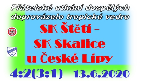 Potvrdit dobrý výkon z minulého týdne v Doksech a v téměř tropickém vedru potěšit předvedenou hrou skoro stovku domácích fanoušků mělo v plánu mužstvo dospělých v utkání proti účastníkovi Libereckého přeboru. SK Skalice před týdnem doma prohrála s Velkými Hamry 3:0, zahodila penaltu i několik slibných šancí a nakonec prohrála. Ve Štětí ale začala velmi aktivně a nestačili jsme se divit, jak nebezpečný soupeř do Štětí přijel. Zaútočili jsme sice jako první, ale nechali jsme se chytit do ofsajdové pavučiny a pak už se hra přesunula na naši polovinu. Ve 2. a hned i v 5. minutě musel v brance zachraňovat Václav Sailer. V prvním případě vyrazil míč na roh a ve druhém zmenšil střelecký úhel a míč za svá záda nepustil. V 9. minutě to byla opět Skalice, která zahrávala roh, a do třetice byl na svém místě Václav Sailer. Hned vzápětí kopal soupeř další roh a pak už se konečně diváci dočkali i trocha toho nebezpečí před brankou našeho soupeře. Nejdříve jsme zahrávali roh a v 16. minutě to přišlo. Jiří Vokoun vybojoval balón na polovině soupeře a před opuštěnou brankou našel Jakuba Slavíčka, který otevřel skóre na 1:0. V 19. minutě už jsme si mysleli, že vedeme 2:0, ale branka Adama Brůži pro postavení mimo hru nemohla platit. Ve 26. minutě se hostům podařilo vyrovnat na 1:1. Míč překvapil všechny, kteří měli bránit pokutové území, a skončil za brankovou čarou. Ve 32. minutě byl hodně blizoučko naší vedoucí brance Miroslav Müller, ale brankář Skalice se postavil proti a skvělým zákrokem vyrazil míč na roh. Ve 35. minutě orazítkoval tyč Marek Polák, míč se stačil ještě odrazit od brankáře a kopal se roh. Po něm už se se Miroslav Müller dočkal. Hlavičkoval přesně a vedli jsme 2:1. Blížil se konec poločasu a kromě toho, že atmosféra na hřišti, ale na i lavičce nebyla zrovna přátelská, tak byly k vidění i brankové příležitosti. Ve 40. minutě kopal volný přímý kop Jiří Vokoun, míč přistrčil krátce na Jakuba Píchu, ale k úspěchu to nevedlo. Stejnou výhodu standardní situace o minutu později měla i Skalice, ale také se neujala. Ve 42. minutě to byl Jiří Vokoun, kde se po přihrávce od Jakuba Slavíčka dostal do nebezpečné šance, ale brankáři byli v tomto utkání oporami svého týmu na obou stranách. Ve 45. minutě se autorem hattricku, pokud tak můžeme nazvat třetí asistenci na gól, stal Jiří Vokoun. Tentokrát poslal do gólovky Jakuba Píchu a ten se nemýlil. 3:1 v poločase byl pro druhou část nadějný výsledek. Jeho začátek jsme však nestačili zachytit a přeneslo se to do výkonu na celý druhý poločas. Do 50. minuty jsme mohli po zaváhání a ztrátách míče ve středu hřiště 2x inkasovat, ale naštěstí se tak nestalo. Naopak v 59. minutě obešel Jiří Vokoun brankáře, míč už mířil mezi 3 tyče, ale z brankové čáry odkopl do bezpečí obránce. V 63. minutě se po pravé straně probil před branku Vít Kala a po jeho přihrávce zvýšil už na 4:1 Adam Brůža. Vyhráno však ale zdaleka nebylo, protože soupeř využíval každé akce, aby korigoval výsledek. Navíc naše hra v podobě zdlouhavé rozehrávky a chyb v přihrávkách k tomu nabízely. V 70. minutě se to nakonec nevyplatilo a Skalice snížila na 2:4. Měla i další šance, ale střelecká muška vázla a kombinace často končila i postavením mimo hru, což hostující lavička těžce nesla a přenášelo se to i na hřiště. Gól do konce utkání už nepadl. Oba týmy kopaly několik volných přímých kopů, zahrávaly se i rohy, ale žádná z těchto situací už konečný výsledek 4:2 pro Štětí nezměnila.