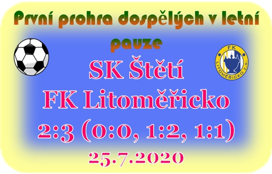Hrálo se většinou na polovině soupeře, měli jsme míč častěji na kopačkách, ale bohužel na to se fotbal nehraje. Ten se hraje na góly a těch dokázalo Litoměřicko vstřelit více. Z naší převahy jsme si moc vyložených brankových příležitostí nevypracovali. Hosté spoléhali na rychlé útoky a to se jim také vyplatilo. Absence gólových hráčů Jiřího Vokouna, Davida Brandejse, Miroslava Müllera, ale i Tomáše Beláka byla znát. Akcím chyběl závěrečný moment překvapení a střel na hostujícího brankáře moc nebylo. V dobrém světle mezi dospělými se ukázali oba dorostenci Aleš Rubín i Jakub Daniluk. Stejně tak dobrým výkonem se prezentovala nová tvář v našem týmu Lukáš Vávra. Hosté se představili jako kvalitní mužstvo, které i v příští sezóně může pomýšlet v Ústeckém přeboru na příčky nejvyšší. I přes velká zranění není čas na odpočinek. Příprava pokračuje a už za týden v sobotu 1. 8. 2020 jedem do Velkých Hamrů, kde nás čeká domácí tým, divizní tým, se kterým jsme se už letos na konci května jednou utkali. Bylo to ve Štětí, kdy jsme v 1. utkání po koronavirové přestávce prohráli vysoko 4:0. Kdo by chtěl vyrazit do krásného prostředí Jizerských hor, tak výkop je v 11:00.