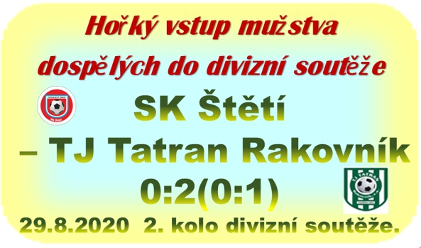 Velké zklamání zavládlo v našich řadách po závěrečném hvizdu a porážce 2:0. Před utkáním jsme si věřili a chtěli vyhrát. Jak zápas hodnotí trenér Josef Jarolím, se dozvíte v reportáži z utkání, která bude na internetu k dispozici zítra v neděli 30. 8. 2020 kolem poledne. Co však víme už dnes je, že střelecký prach štětského výběru zůstal v sobotu uschován a bez vstřelených gólů se těžko vítězí. Soupeř pozorně bránil a vyrážel k rychlým protiútokům. Moc šancí ale neměl a tak nakonec rozhodly penalty. Ty souvisí s tím, o čem se hodně těžce píše, protože je to hodně citlivé téma, které vyvolává diskuze v řadách fanoušků, ale i řídících orgánů a neradno se o tom zmiňovat. I tak jsme se rozhodli kritizovat. Náhoda, že po roce na zápas s Rakovníkem přijeli 2 ze 3 loňských rozhodčích? Velmi dobře si pamatujeme, jaký to mělo loni průběh. Na tehdejší rozhodování se těžko zapomíná. Chtěli jsme otočit list, ale bohužel černý scénář se naplnil znova. Kdo utkání viděl, ví o čem je řeč. 2 penalty proti našemu týmu, ta druhá v době, kdy vrcholila naše snaha o vyrovnání a ještě po jasném ofsajdu. Popisovat tady jednotlivé situace nemá cenu, ale pocit z jednostranně řízeného utkání zůstává, protože byl evidentní od úvodního hvizdu. Je to škoda, protože výkony rozhodčích byly v loňském roce dobré, až teda na zapas s Tatranem Rakovník. Za týden v sobotu 5. 9. 2020 hrajeme v Českém Brodě, kde nás v 17:00 čeká loňský první celek divizní soutěže skupiny B.