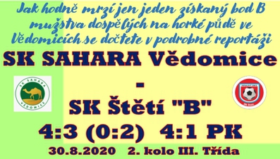 Výsledky 1. kola III. Třídy týden před tímto utkáním byly pro obě mužstva zcela rozdílné. My jsme doma prohráli celkem jasně se Straškovem 4:0, to domácí Vědomice se činily a z Břízy přivezly výhru 6:2. Sestava našeho týmu byla hodně pestrá, v základu se objevili 4 hráči kádru A mužstva, 2 dorostenci a na lavičce měl hlavní trenér Pavel Minárik ještě připravených 7 borců. Jen co hlavní rozhodčí utkání zahájil, tak se bylo na co dívat. Obě mužstva nasadila vysoké tempo a na to, že se jednalo o zápas III. Třídy, tak se hrálo na velmi dobré úrovni. Domácí se snažili rychle přenášet hru do našeho pokutového území a prosazovat se jeden na jednoho. Naše jedenáctka se velmi rychle přizpůsobila a již ve 12. minutě udeřila. Navrátilec na hřiště, po dlouhém zranění Adam Brůža, poslal balón na Tomáše Danče za obranu a ten po krásné těžko chytatelné střele rozvlnil síť za zády Tomáše Ortbauera. V 19. minutě po rohu hlavičkoval nebezpečně hráč domácích těsně nad naší branku. O 10. minut později zahrávalo roh i naše mužstvo, konkrétně Rudolf Slanička, pro kterého to po dlouhé době bylo také první utkání, před brankou se z čista jasna mezi všemi objevil David Čada a zvýšil na 2:0. V prvních 45 minutách už branka nepadla, i když nutno podotknout, že šancí měl domácí výběr celkem dost, ale v brance stál neprůstřelný Josef Horáček, jehož excelentní výkon měl pokračování i po změně stran. V 53. minutě předvedl fantastický zákrok proti střele domácího borce přímo z první. Uklidnění do našich přinesla 59. minuta. Skoro z půlky hřiště zahrával volný přímý kop Slanička a míč po dlouhém nákopu překvapil všechny, ale nejvíce brankáře, když dopadl za jeho záda na 3:0. Domácí ale ani po této inkasované brance nesložili zbraně. Zakládali jeden útok za druhým a naše obrana měla hodně práce. Když už to nezvládla, tak byl zase připraven brankář Josef Horáček. Teda až do 73. minuty. Obrana nestačila odkopnout míč kam patří, teda do bezpečí, toho se zmocnil Jan Pokorný a snížil na1:3. Lavička Štětí si začala uvědomovat, že vyhráno ještě zdaleka není. O to více , když Rudolf Slanička z volného přímého kopu trefil jen zeď. Další zásah do naší stále více rozhozené obrany přišel v 82. minutě, kdy Jan Chládek snížil už jen na 2:3. Rázem z toho bylo velké drama se smutným koncem pro Štětí. Běžela 1. minuta nastavení, kdy se v naší šestnáctce dostal k míči Jan Schovanec a nezadržitelně vyrovnal na 3:3. V nastavených 6 minutách se ještě obě mužstva snažila dokonce strhnout vítězství na svou stranu a šance nato měla. Skóre už se nezměnilo a šlo se na penalty.