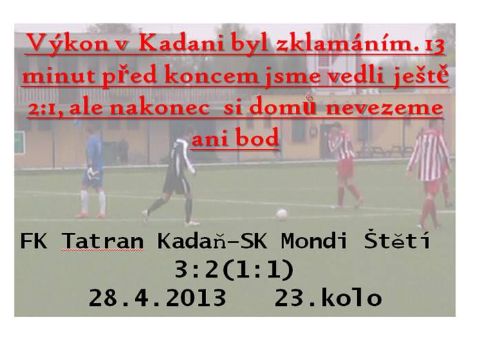 Lepší začátek zápasu si nepředstavoval ani ten nejlepší optimista. Slanička měl po rohu Stejskala v 1. min.gól na hlavě, ale branku netrefil. To nebylo ale to hlavní. Běžela 3. min., když dlouhým centrem Pícha našel nabíhajícího Kalu, který v tomto zápase dostal příležitost od začátku zápasu a neviditelnou hlavičkou i s pomocí tyče , od které se míč odrazil do branky jsme šli do vedení 1:0. Naše aktivita pokračovala i po vedoucí brance. Kala zkoušel najít z brankové čáry Remence, který zůstal ukryt za obranou. Slanička hlavičkoval tentokrát do branky, ale zde čekala otevřená náruč brankáře. Domácí zlobili hlavně po pravé straně z našeho pohledu, ale žádné větší šance až na pár rohů z toho nebylo. Ve 22. min zahrál k bližší tyči solidně roh Remenec ,ale brankář balon vyboxoval pryč. Ideálnější pozici k rozehrání přímého trestného kopu měl Stejskal v 31.min. , ale skončilo to neslavně střelou vysoko nad. Belák ve 34. min svedl sprinterský souboj s brankářem , u míče byl dříve,ale ten proletěl těsně mimo branku. 36. minuta byla osudnou pro hráče domácích Podroužka, který dost nepochopitelně zasáhl při výkopu nedovoleně našeho brankáře a po druhé žluté kartě musel do šatny. Od tohoto okamžiku se obraz hry na hřišti změnil. Místo aby se to stalo výhodou pro naše mužstvo, tak opak byl pravdou a důkazem byla i branka v naší brance 2 minuty před změnou stran(1:1). Naše doba temna pokračovala i po změně stran. Ve 48. min. musel vytáhnout ze svého repertoáru výborný zákrok Michovský a míč vyrazil na roh. Nebezpečný byl i roh domácích o chvilku později, kdy si naše obrana dávala přednost v tom kdo odkopne míč do bezpečí. Ač jsme hráli o jednoho hráče v poli více, tak jsme stále setrvávali ve hře na jednoho útočníka a bránili remízový výsledek. V 53.minutě se domácí dost nahlas dožadovali pokutového kopu, ale píšťalka rozhodčího slyšet nebyla. Většinu času se hrálo na naší polovině a ani na chvilku nemohla naše pozornost polevit. Michovský měl starosti s míčem, který těsně před ním odskočil, ale zvládnul to. Skupina štětských fanoušků se nestačila divit co se to naším mužstvem děje. To hlavní, co se mělo v tomto zápase odehrát nás teprve čekalo. Pícha využil zbytečnou ztrátu míče obránce domácích a pod nohy brankáře rozradostnil naše řady vedoucí brankou na 2:1. Chvilku se zdálo, že naše hra se zklidní a spolehlivou taktickou hrou zápas dovedeme do vítězného konce. Pícha z volného přímého kopu mohl zvýšit, ale vysoko přestřelil. Pak to však přišlo v 77.minutě jsme nevzali varování domácích na vědomí, nechali jsme míč proletět skrz malé vápno, ale naštěstí ani domácí do míče nekopli. 78.minuta už ale znamenala vyrovnání na 2:2. Centr do našeho vápna , kde byli čtyři naši obránci a jeden útočník hostů, kterému jsme však nevěnovali vůbec žádnou pozornost a vyrovnání hlavou na 2:2 bylo na světě. To ale nebyl ještě konec. O minutu později jsme ztratili na polovině hřiště zbytečně míč a stejný hráč, který chvilku před tím vyrovnal ,dokonce hezkým průnikem a zakončením dostal domácí Kadaň do vedení 3:2. Ledová sprcha polila všechny naše hráče i lavičku. Minutu před koncem ještě P.Vaněk namazal hráči hostů a jen díky zákroku Michovského se na ukazateli skóre čísla neměnila. Na vyrovnání už nám síly nezůstaly a tak nám po závěrečném hvizdu nezbylo nic jiného než soupeři poblahopřát k zisku 3 bodů. Porážka z pohledu postavení a změn v tabulce pro nás neznamená nic z čeho by jsme měli propadat panice. Na druhou stranu ale nutno náš výkon ohodnotit známkou dostatečný. Jak po taktické tak herní stránce jsme zklamali. Hra na 1 útočníka nebyla šťastným řešením. Na vývoj zápasu se mělo reagovat a nezůstat v pasivní pozici, jak to ve druhém poločase vypadalo. Závěr zápasu jsme si také představovali trochu jinak. Vést 13 minut před koncem a nakonec prohrát nasvědčuje, že něco nezafungovalo. Nyní nás čekají Blšany, které na jaře sice dobře nehrají, ale podcenění by se nám mohlo vymstít, jako v tomto zápase.