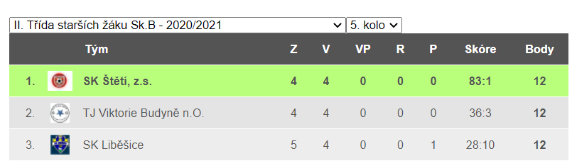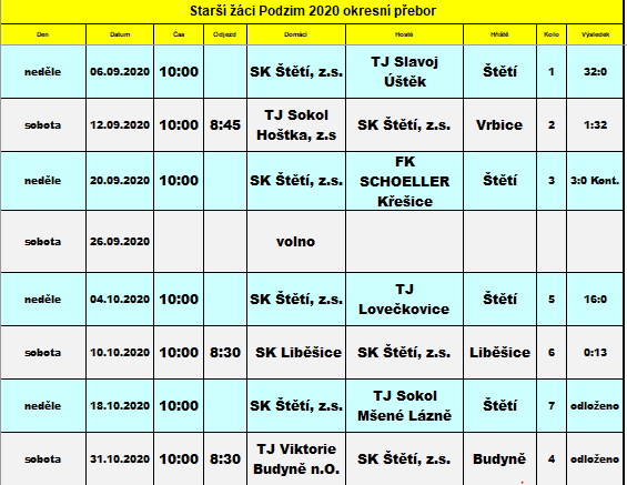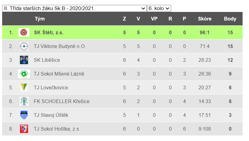 V loňském předčasně ukončeném ročníku okresního přeboru 2019/2020 patřilo starším žákům po 15 zápasech 1. místo. Získali stejně jako druhá Hoštka 42 bodů, ale skóre 171:12 je zařadilo na první místo. Síla mužstva v podobě kádru se pro nový ročník okresního přeboru 2020/2021 moc nezměnila a mužstvo to potvrdilo hned v 1. kole 6. září 2020 doma proti Slavoji Úštěk, kterému nasázeli 32 branek a žádnou neinkasovali. Oproti loňskému ročníku okresního přeboru starších žáků, kdy hrálo 16 mužstev v jedné skupině dvoukolově každý s každým, se letos 17 mužstev rozdělilo do dvou skupin a hrají také dvoukolově. I když je na konec soutěže naplánována nadstavba o umístění v podobě 2 zápasů, tak je to i tak velký úbytek zápasů v porovnání s loňským rokem. Zatím jsme však u 2. kola, ve kterém se ve Vrbici, kde má z důvodu rekonstrukce vlastního trávníku svůj dočasný azyl TJ Sokol Hoštka, utkala 2 nejlepší mužstva loňského ročníku. Derby Hoštka – Štětí však mělo od začátku jasný průběh a bylo jen otázkou, kolika zásahy se štětským žákům podaří konto soupeře zatížit. Nakonec si jich hlavní rozhodčí Milan Bartůněk zapsal do svého notesu 32. Desítku v tomto utkání roztočil Petr Hůrka a také se mu jí v 65. minutě brankou na 31:1 podařilo dotočit. V neděli 19. září bylo na programu 3. kolo, ve kterém jsme na domácím trávníku marně čekali na příjezd FK SCHOELLERU Křešice. Výsledek řešila disciplinární komise, ale moc práce neměla. 3:0 kontumačně pro Štětí. Ve 4. kole 26.9.2020 se měla původně utkat 2 nejlepší mužstva dosavadního průběhu soutěže. 9 bodová TJ Viktorie Budyně n.O. a SK Štětí. Soupeř ale z důvodu konaní hasičského dne právě v tomto termínu na hřišti v Budyni, požádal o přeložení na 31. 10. 2020. Zápasová přestávka se nám tak prodloužila o další týden, ale to jsme ještě netušili, že Covid znova udeří a hrát se nebude ani 31. 10. 2020. Další utkání čekalo starší žáky první říjnovou neděli. 4. října 2020 jsme doma porazili sympaticky hrající celek TJ Lovečkovice 16:0. Dramatické a zajímavé utkání se očekávalo 10. října v Liběšicích 10. 10. 2020, kam zajíždělo naše mužstvo. 3 týmy na čele tabulky bez ztráty bodu a právě 2 z nich se utkala v 6. kole. Drama to ale nebylo. Už v 5. minutě otevřela skóre nová tvář v našem celku Jakub Jeník a pak už to pravidelně narůstalo až na krásných konečných 13:0.