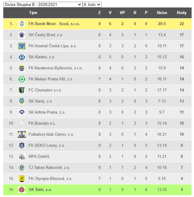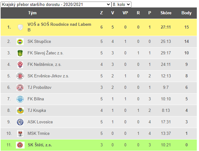 | 10. | SK Štětí, z.s. | 22 | 50:139 | 15 |