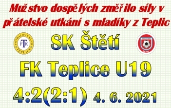 Po dlouhé době zápas. Naposledy 10. října loňského roku v Chomutově v 8. kole divizní soutěže. Do Štětí přijeli mladící z Teplic, kteří prověřili formu týmu po kovidové pauze. Soupeř přijel se zajímavou s výhrou před týdnem v Mostě Souši 3:0a byli to také oni, kdo si po našem zaváhání ve středu hřiště vypracoval šanci a zasahovat musel Václav Sailer v brance. Reakce přišla okamžitě. Rychlý útok po pravé straně založil Miroslav Müller, zvolil přihrávku, ale adresáta nenašel. Hosté od začátku předváděli, že jejich silnou zbraní bude rychlý útok a ve 12. minutě už se také trefili. Pomohli jsme tomu ale chybnou rozehrávkou, po které šly Teplice do vedení 1:0. První roh zápasu zahrával ve 20. minutě Jiří Vokoun, ale byl z toho nakonec nebezpečný protiútok soupeře, který naštěstí pro nás brankou neskončil. Postupně jsme se začali sehrávat a ve 2. polovině poločasu jsme začínali získávat pevnou půdu pod nohama. Kopali jsme několik rohy a prosazovali se křídelní hrou. Nejnebezpečnější byl ve 33. minutě průnik Tomáše Beláka, ale ani ten brankou neskončil. Teplice měly výhodu volného přímého kopu, ale ten skončil home ranem. Skóre se měnilo až v závěru poločasu. Nejprve si na centr zprava k bližší tyči naběhl David Čada a pohotově vyrovnal na 1:1. V poslední minutě 1. poločasu jsme ještě zahrávali volný přímý kop a spolupráce Jiřího Vokouna, Michala Obrtlíka byla zásluhou druhého jmenovaného korunována branku na 2:1. Druhý poločas jsme zahájili snahou zvýšit vedení, ale pozorně bránili a spoléhali na rychlé brejky. Byl to ale náš tým, kdo byl blíže k brance, ať už po rozích Jiřího Vokouna nebo po největší šanci v 64. minutě, kterou měl Miroslav Müller, když z dorážky z několika metrů branku přestřelil. Navýšení náskoku jsme se dočkali v 74. minutě. Tomáš Belák našel před brankou volného Miroslav Müllera, který se tentokrát už nemýlil a upravil na 3:1. V 88. minutě vyhrál osobní souboj Jiří Vokoun, a protože i brankář byl daleko ze své svatyně, tak toho Jirka využil k jeho přehození, kterým upravil na 4:1. V poslední minutě utkání, kdy už jsme se viděli v šatně, se ještě prosadily Teplice, které upravily na konečných 2:4 z jejich pohledu.