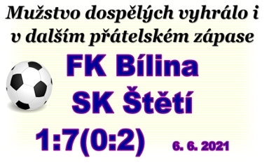 Ani ne po 48 hodinách nastupovalo mužstvo dospělých k dalšímu přípravnému zápasu. Čekal je podle zařazení do soutěže slabší soupeř, účastník I. A Třídy Ústeckého přeboru FK Bílina. Chtěli jsme navázat na dobrý páteční výkon proti Teplickému dorostu a hned po zahájení jsme se přestěhovali na polovinu soupeře. V prvních 15 minutách jsme domácí zmáčkli a vypracovali si 3 velké šance, které volaly po gólu. Volný přímý kop v 5. minutě po faulu na Davida Čadu ještě velké nebezpečí pro domácí neznamenal, ale výměna míče mezi Davidem Menclem a Miroslav Müller už byla parádní. Druhý jmenovaný trefil pravou tyčku, která zvoní ještě teď. V 11. minutě se do vápna soupeře protlačil David Čada a střela, která byla i lehce tečována se zastavila na tyči. No, a do třetice to byl Miroslav Müller, který se ocitl sám před brankářem, který skvělým zákrokem míč za svá záda nepustil. Když se to nepodařilo zblízka, tak si postavil ve 26. minutě míč k exekuci volného přímého kopu Rudolf Slanička a z dobrých 25 metrů nachytal domácího brankáře na švestkách, když uklidil míč k jeho pravé tyči na1:0. Další velkou možnost měl Muamer Mešič ve 33. minutě. Prošel až před brankáře, ale trefil jen prostředek branky, kde stál gólman. Dočkali jsme se ve 35.minutě, když už se konečně trefil Miroslav Müller, který zakončil svojí slabší levou nohou na 2:0. Jedinou větší šanci dostat se před naši branku měla Bílina v 1. poločase při volném přímém kopu v 43. minutě, ale míč do bezpečí dostala hlavička Davida Mencla. Úplný závěr 1. půle patřil Jiřímu Vokounovi. Prošel z vlastní poloviny až před branku Bíliny, kde předložil nabídku Muameru Mešičovi, ale tak jako spousta dalších brankových možností v 1. poločase to gólem neskončilo. Krásnou branku viděli diváci hned po změně stran. Muamer Mešič se vymotal z klubka těl hráčů Bíliny a nádhernou střelou vymetl pavučinu mezi spojnicí tyče a břevna. Vedení 3:0 jsme ale dlouho nedrželi. Hned po rozehrávce ze středu hřiště utekl domácí útočník a pohotově snížil na 1:3. Obraz hry to ale moc nezměnilo a herní převaha našeho týmu pokračovala. Před brankou Bíliny to bouřilo po trestném volném přímém kopu v 56. minutě, ale brankou to nakonec neskončilo. V 59. minutě nabídl gól Miroslavu Müllerovi Jiří Vokoun. Brankář domácích míč vyrazil nohama. V 63. minutě se branky dočkal Jiří Vokoun. Na hranici šestnáctky si našel místo k zakončení a upravil na 4:1. Krásnou individuální šanci předvedl Miroslav Müller v 72. minutě. Prošel z vlastní poloviny přes 3 obránce a jeho střela skončila na tyči. Akce si zasloužila branku. Na 5:1 se skóre měnilo v 76. minutě. Zasloužil se o to Jiří Vokoun, který přihrál před prázdnou branku Jakubovi Píchovi a bylo hotovo. Podobný průnik do vápna jako při předcházející brance předvedl Jiří Vokoun v 81. minutě a těžil z toho gólem na 6:1 Petr Kovařík. Poslední branku zápasu viděli diváci 3 minuty před koncem. Opět Jiří Vokoun po samostatném úniku obešel brankáře a tentokrát už nebylo komu přihrávat a stanovil konečný výsledek 7:1.