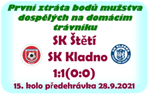 Jen 3 dny po domácím vítězném zápase nastupovali fotbalisté SK Štětí k dalšímu domácímu utkání. V předehrávce 15. kola jim los v úterý v den státního svátku 28. září přidělil SK Kladno. Mužstvo, které v posledních 3 kolech 3x slavilo výhru. V úvodu jsme byli ve hře dopředu aktivnější a zkoušeli prověřit pevnost hostující obranu. Jiří Vacek zpozoroval Jiřího Vokouna, který se do týmu vrátil po 3 absencích, když reprezentoval naši vlast na mistrovství světa ve futsale v Litvě a opět se představil v základní sestavě, moc nechybělo, aby se uvedl brankou. K míči mu chyběl metr. Kladno se vydalo na zteč v 10. minutě, ale v rozhodujícím okamžiku přestal útočníka míč poslouchat. Ve 13. minutě už se hosté radovali z branky, ale bylo to předčasné, protože branka padla z postavení mimo hru. Když pak Matěj Javorek v 15. minutě odvrátil míč po rohu Štětí do bezpečí, tak na ukazateli skóre stále svítil výsledek 0:0. Skóre se neměnilo ani ve 23. minutě, i když si mladík Matěj Šnobl hezky zaběhl za obranu, ale síť rozvlnil jen z venku. Jiří Vacek hledal z rohu na zadní tyčí Michala Obrtlíka ve 32. minutě, ale míč po jeho hlavičce sklouzl mimo branku. Muamer Mešiš se snažil 6 minut před změnou stran vymodlit penaltu, ale nedočkal se. 2 minuty před odchodem na přestávku se po pravé straně dostal k brance Tomáš Belák, ale spoluhráče před brankou nenašel. To čeho se diváci nedočkali v prvních 45 minutách, tak po změně strana trvalo jen 5 minut. Jiří Vacek poslal balón na hlavu Tomáše Beláka, který na hranici pokutového území zpozoroval Jiřího Vokouna, a šli jsme do vedení 1:0. Z kabiny hostů bylo o přestávce slyšet, že je to zápas o jedné chybě. Hosté volili vyčkávací taktiku a čekání na naši chybu. Tyto pokyny se ale změnily po naší změně skóre. Kladno se vrhlo do útoku a rázem jsme začali mít starosti v obraně. Čelili jsme volnému přímému kopu a David Čada odvracel míč do bezpečí jen za cenu rohu. Branky se hosté dožadovali v 56. minutě a už neviděli, že byl při ní faulován Michal Obrtlík. Převaha hostů se zvyšovala. Pokoušeli jsme se o kontry jako třeba při střele Patrika Škody nebo střele Jiřího Vacka z těžkého úhlu. Výsledek se ale neměnil a stále zůstával 1:0 v náš prospěch. Hosté zahrávali rohy, volné přímé kopy a hledali cestu jak se dostat k vyrovnání. 10 minut před koncem přišel rozhodující moment utkání. Rudolf Slanička ve vlastním pokutovém území trefil míč a přes jeho nohu přepadl hráč soupeře. Tak to viděli všichni diváci na této straně hřiště, hlavní slovo si vzal ale pomezní Václav Kubec, který má i ligové zkušenosti, a vydal se k velkému vápnu, tím dal pokyn hlavnímu, ať nařídí penaltu. Ten tak uděl a z ní Matěj Šnobl, i když Michal Vondrka v brance, který musel nahradit v průběhu utkání zraněného Václava Sailera, ji málem chytil, vyrovnal na 1:1. Pak si ještě obě mužstva připravila roh i volný přímý kop, ale z těchto standardních situací už na jedné ani druhé straně nezapršelo. Byl tu konec 3. minutového nastavení a po remíze 1:1 se body dělily.