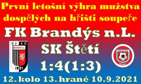 Utkala se 2 mužstva ze středu tabulky se stejným počtem 18 bodů a obě dokonce před týdnem bodovala za 3 body. V sobotu dopoledne jsme se na hřiště soupeře vypravili s úkolem získat body, minimálně 1 nejlépe všechny 3, který by nejenom znamenaly naší letošní první výhru u soupeře, ale také první výhru v Brandýse n.L. v dosavadní historii mistrovských zápasů. Už v první minutě jsme museli zpozornět, ale střela jednoho z hráčů domácích byla pro brankáře Štětí snadnou lahůdkou. Ve 4. minutě hledal skulinku v obraně domácích Muamer Mešič. Mířil k zadní tyči, ale míč skončil půl metru vedle. Dění mělo v prvním poločase rychlý spád. Volný přímý kop na konci 6. minuty jsme ubránili jen za cenu rohu. Vzal si ho na starost Martin Kovařík a u zadní tyče Patrik Zamazal nemusel ani skákat, aby hlavou téměř z brankové čáry přivedl domácí do vedení 1:0. Dění na hřišti co se brankových příležitostí týče, mělo v 1. poločase rychlý spád. Ve 14. minutě se své šance zalekl David Mencl a střelu z velmi nadějné pozice ve vyrovnání nezužitkoval. Byl z toho jen bezúspěšný roh. Hned z protiútoku kopal soupeř také roh, ale balón byl až moc dlouhý a nikdo z domácích se k němu nedostal. Navýšit náskok na 2 branky se domácím nabídlo o chvilku později, ale střelu výborně pokryl Václav Sailer a v důležitém okamžiku utkání mužstvo podržel. Ve 20. minutě mohl naopak vyrovnat Jiří Vokoun, ale ani on proti Jakubu Janáčkovi v brance neuspěl. Zase z toho byl jen roh. I když ne ledajaký. Rozehrál ho Jiří Vokoun, nepokrytý zůstal Tomáš Belák, který vyslal jednu Belákovku a bylo to 1:1. Ve 31. minutě jsme měli další důvod k radosti. Jiří Vokoun dlouhatánským míčem hledal na druhé straně hřiště Davida Čadu. Před ním se nešťastně srazil obránce Jan Pechanec s vlastním brankářem a David Čada už pak měl snadnou práci. 2:1 pro Štětí. Hodinu ukrojili další minutu a mohlo být srovnáno. Přišel však druhý báječný a důležitý zákrok Václava Sailera v brance a vyrovnání se nekonalo. Domácí v průběhu celého zápasu kopali spoustu rohu, a pokud by si dal někdo tu práci a spočítal je, tak by se určitě přiblížil hodně blízko k číslu 20. Pojďme ale na závěr 1. půle. Lepší jsme si přát nemohli. Vstřelili jsme branku do šatny. Důrazné napadání soupeře na jeho polovině přineslo své ovoce v poslední minutě před přestávkou. Hlavní roli ve sběru sehráli Jiří Vokoun, který přihrál Rudolfovi Slaničkovi a ten s pomocí teče zajistil poločasové vedení 3:1. Druhou půlku jsme začali bráněním volného přímého kopu, úspěšně a jsme čelili jednomu rohu za druhým. Na polovinu soupeře jsme se moc často nedostávali a v rozehrávce chybovali už na vlastní polovině. V 58. minutě se Brandýs dožadoval penalty, ale hlavní arbitr David Šmat byl jiného názoru. Mimochodem rozhodčí v tomto utkání rozhodovali velmi dobře a je třeba uznat, že naše obavy v tomto směru byly liché. Na hřiště s cílem oživit hru přišel v 57. minutě Patrik Škoda a v 64. minutě už před ním stál jen brankář, kterého bohužel neprostřelil. Smutnit jsme ale nemuseli, protože přišel roh a před Lukášem Janovským se otevřela prázdná branka a bylo to již 4:1. Vyhráno ještě nebylo, ale k zisku 3 bodů jsme se hodně přiblížili. O to více, když Václav Sailer za svá záda nepustil hlavičku útočníka domácích a stále držel tříbrankové vedení. To trvalo i po dalším rohu a hlavičce domácích těsně vedle. V 75. minutě jsme čelili volnému přímému kopu, ale naše obrana se stala nepropustnou. To už se ale blížil závěr. V 83. minutě kopal volný přímý kop Rudolf Slanička, ale trefil jen zeď. 3 minuty před závěrečným hvizdem měli stejnou výhodu domácí, ale ani oni branku nevstřelil. Pak přišel závěrečný hvizd a první letošní vítězství bylo na světě.