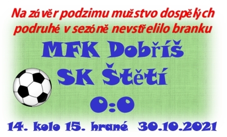 Pro 250 diváků, kteří se přišli v Dobříši podívat na poslední podzimní utkání, to moc hezká podívaná nebyla. Zápas doprovázela velká spousta osobních soubojů a branek se nedočkali. Většinu utkání jsme byli aktivnější než domácí, vypracovali si i více brankových příležitostí, ale žádnou z nich jsme do úspěšného konce nedotáhli. Za zmínku stojí šance Rudolfa Slaničky, který pod tělem brankáře z 2 metrů míč do sítě nedostal. Po změně stran to byl zase Jakub Janovský, který postupoval sám na brankáře, ale míč tím správným směrem nezacílil. Domácí to zkoušeli hlavně rychlými brejky, ale žádný z nich do konce nedotáhli. Zisk bodů nás v tabulce s 23 body řadí na 9. místo v podzimní části soutěže. Zimní zápasová přestávka, ale ještě nezačíná. Před námi jsou letos ještě 3 přátelská utkání a to první v pátek 12. listopadu od 18:00 s Velvary na jeho hřišti.
