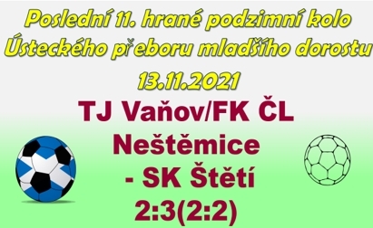 Poslední zápas mladších dorostenců v podzimních části Ústeckého přeboru. Hrálo se ve Vaňově. Soupeřem byl 9 bodový sdružený tým, který do tohoto zápasu získal 9 bodů oproti našim 17. Odjeli jsme bez jedné z opor zadních řad Michaela Migy, ale to neznamenalo, že se domů nechceme vrátit se 3 body. Do zápasu lépe vstoupili domácí, kterým patřilo úvodních 5 minut, ale pak už do utkání vstoupilo naše mužstvo a ve 14. minutě po hezké kombinační akci a střele Jana Chromého do prázdné branky jsme se ujali vedení 1:0. Když pak ve 24. minutě zvýšil na 2:0 Miroslav Volák, tak se zdálo, že máme utkání pod kontrolou. To jsme se ale přepočítali. Hned o 2 minuty později jsme se v obranné činnosti dopustili hrubky, kterou Daniel Urbánek dokázal potrestat brankou na 1:2. Domácí stačili dokonce poločasu dokonce vyrovnat. Po rohu trefil jeden z hráčů soupeře nohy bránícího Daniela Ivaniče tak šikovně, že se míč odrazil do branky a na světě byl vlastní gól na 2:2. Do 2. části jsme vyběhli s určitými změnami v rozestavění hráčů a začali jsme si vytvářet nadějné střelecké příležitosti. Kopali jsme i spoustu rohů až v 74. minutě přišel ten pravý. Zahrával ho Miroslav Volák a nádherný letecký den předvedl po centru Daniel Ivanič. Hlavou dostal naše mužstvo do vedení 3:2. Ve zbývajících minutách zápasu se už nic důležitého neodehrálo a v klidu jsme dokráčeli k zaslouženému vítězství.