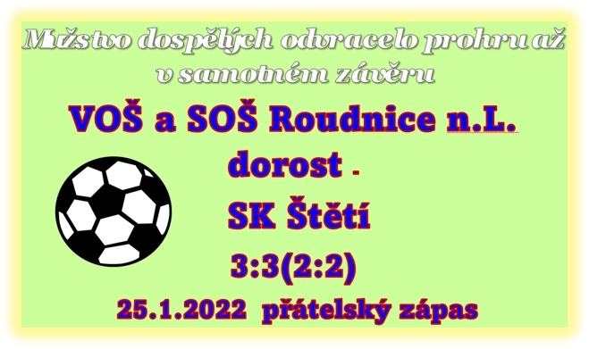 Místo tréninku si v úterý večer zahrálo mužstvo dospělých přátelský zápas s dorostenci Vyšší odborné a Střední školy Roudnice n.L., kteří hrají divizní soutěž a po podzimní části kralují jedné ze skupin. Role favorita nám byla jasně dána a již v 7. minutě po chybě soupeře v rozehrávce, se míče zmocnil Miroslav Muller a s přehledem zakončil na 1:0. Než jsme se však stačili zaradovat, tak pro změnu po chybě naší obrany to bylo 1:1. V dalším průběhu poločasu byl míč častěji na našich kopačkách, ale naráželi jsme na pevný obranný vál soupeře, který všechnu naši snahu dostat se do zakončení nepřipustil. Roudnice n.L. hrála důrazně a nenechala nám ani vteřinu se s míčem pomazlit. Navíc trestala každou ztrátu míče rychlými protiútoky a po jednom z nich nás také potrestala brankou na 2:1. Vyrovnat se povedlo ve 21. minutě , kdy se po přihrávce Jiřího Vokouna opřel do míče šajtlí Rudolf Slanička a srovnal na 2:2. Po změně stran se obraz hry moc nezměnil. Hrálo se většinou na polovině soupeře, ale našim útokům chyběl moment překvapení a hra středem neměla naději na úspěch. Zkoušeli jsme také posílat centry před branku, kopali jsme poměrně dost rohů, ale, jak se říká v jednom českém filmu „je to marný, je to marný“ přesně tak se dá zhodnotit štětská ofenzíva. Snad jen střela Jiřího Vokouna potěšila oko diváka, ale s tou si zase poradil brankář a vytěsnil míč na roh. Do konce zbývalo 15 minut, když jsme se ve středu hřiště připravili o míč a po brance na 3:2 pro soupeře mohli jen zpytovat svědomí. Roudnickým dorostencům k vítězství moc minut nechybělo, když se střelou do opuštěné branky podařilo Rudolfovi Slaničkovi vyrovnat na konečných 3:3.