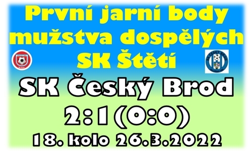 První jarní výhra přinesla určitou úlevu a byla i určitým vysvobozením z prohry, kterou jsme před týdnem utržili na hřišti posledního celku tabulky Tatranu Rakovníku. Zápas to byl vyrovnaný. V 1. poločase byl Český Brod o něco nebezpečnější. Střel na štětskou branku poslal více než naše mužstvo, ale ani jednou to k úspěchu nevedlo. Po změně stran jsme si úlohu vyměnili a před brankou Českého Brodu jsme v nebezpečných situacích byli vidět mnohem častěji. Byly z toho také 2 pokutové kopy, které Muamer Mešič proměnil. V závěru, když soupeř v 90. minutě snížili na 1:2, jsme se ještě v 3. minutovém nastavení strachovali, ale dopadlo to dobře a výhra 2:1 byla na světě. Za týden 2. dubna jedeme do Ostrova, který bojuje o záchranu.