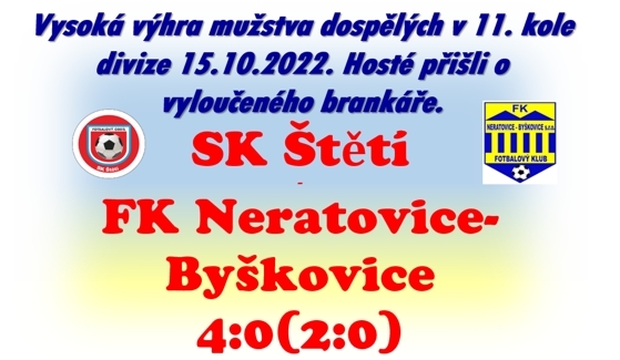 Naše postavení v tabulce pře 11. kolem nebylo zrovna uklidňující a doma jsme potřebovali nutně získat body. Do Štětí přijely Neratovice-Byškovice, které nedávno vyměnily trenéra, přišel Pavel Janeček a zřejmě to týmu svědčí, protože v posledních 5 kolech soupeř 4x vyhrál a 1x remizoval. My jsme před týdnem těsně prohráli na hřišti 2. celku tabulky v Lounech 2:1, i když podle proběhu zápasu jsme si i bod asi zasloužili.