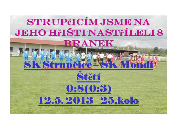 V neděli dopoledne jsme zajížděli na hřiště posledního mužstva tabulky a to nevelelo nic jiného než vyhrát. Strupčice před týdnem vybojovali remízu v Krupce 0:0 a největší chybou by bylo podcenění Začalo se také podle našich not. Hned v 1. minutě hezky vystřelil Tichý, ale míč skončil těsně vedle. 4. minuta už byla gólová. Ofenzivní dvojice Remenec, Kala se vydala na zteč, prvně jmenovaný centroval a Kala naznačil, když hlavou umístil míč do šibenice na 1:0, že se mu podzimní střelecká forma vrací. Domácí ale pole nevyklidili a využívali každé příležitosti, jak naši obranu rozhodit. Naše mužstvo kopalo v úvodu několik rohových kopů, ale ani v jednom případě jsme jej nepřetavili v gólovou příležitost. V 18. minutě nám zatrnulo po zbytečné ztrátě míče při založení útoku a hráči domácích nás poprvé v tomto zápase trochu více vystrašili. Čas první půlhodinky se začal naplňovat, když si míč mezi 3 protihráči vzal Tichý a prošel s ním až do zakončení v podobě nechytatelné střely(2:0). Hned po rozehrávce ze středového kruhu mohli domácí snížit, ale ani jeden ze 2 nebezpečných pokusů nevyšel. O 2 minuty později jsme nevěděli, kde nám hlava stojí. Míč létal před naší brankovou čarou, jak smyslu zbavený, ale ani jeden hráč Strupčic ho nebyl schopen dostat do naší branky. Rychle jsme se vzpamatovali a po rozehrávce od rohového praporku hlavičkoval těsně nad Šmidrkal. Kala pláchnul všem pronásledovatelům a na ukazateli skóre se kromě 36. minuty objevil i výsledek 3:0. V úplném konci poločasu jsme si vypracovali další 2 příležitosti. Kala hledal před brankou spoluhráče, ale brankář jeho úmysl vystihl. Pak ještě Šmidrkal už podruhé v tomto utkání hlavou těsně minul. Kdo z domácích si myslel, že domácí se ještě pokusí něco s nepříznivým vývojem zápasu udělat ve druhé části, tak se spletl. Hned z našeho prvého útoku ve druhém poločase pálil Belák. V 50. minutě se z poloviny hřiště vydal do útoku Belák. Dlouho přemýšlel komu nahrát, ale nedůrazná obrana ho nakonec nechala projít až na úplný dostřel branky a výsledek 4:0 byl pro domácí asi tím konečným hřebíčkem. Kam? Není třeba rozepisovat. Hra domácích se sesypala jak hodně chatrné domino a dění na hřišti jsme zcela ovládli. V 59. minutě se na lajně skvěle uvolnil střídající Rejman a chyběla jen přesná přihrávka. V 62. minutě zívala na stejného hráče prázdná branka. Šance se zalekl a branku netrefil. První zásah v naší brance ve druhém poločase předvedl Michovský až v 65. minutě, kdy míč směřující k jeho levé tyči vyrazil na roh. Běžela 67. minuta, když pelášil Slanička po pravé straně na branku Strupčic. S míčem se dostal mimo střelecký dosah, tak míč nakopl před branku, kde po několikerých pokusech byl tím úspěšným střelcem na 5:0 nakonec Stejskal. 18 minut před koncem se naposledy ozvali domácí. Bylo to z volného přímého kopu, ale zase až tak velké nebezpečí pro naši branku z toho nebylo. To Stejskal měl v 77.minutě 2 velké šance. Při té první zato asi mohl drn, že špatně trefil a při té druhé to byly špatně naštelované kopačky. Při další akci v 79. minutě radši volil nahrávku na Rejmana ten dopravil míč mimo dosah brankáře na 6:0. V 84. minutě si tito hráči úlohu vyměnili a Stejskal svoji druhou brankou v zápase zvyšoval už na 7:0. K našemu letošnímu nejvyššímu vítězství 8:0 přispěl nakonec i kapitán mužstva Petr Tůma 2 minuty před koncem, když se v pokutovém území nejlépe zorientoval a poslal míč, kam chtěl, teda do branky. Do Strupčic jsme si jeli pro 3 body. Podařilo se, ale že to bude zase až, tak vysoké vítězství jsme nepočítali. V prvém poločase náš výkon i přes vedení 3:0 zase až tak přesvědčivý nebyl, ale ve druhém jsme roztočili před brankou soupeře střelecký kolotoč, který mohl skončit i vyšším počtem branek v síti Strupčic než jenom 5. Ve druhém poločase byla na naší hře vidět velká herní pohoda. Blahopřejeme a děkujeme za předvedený výkon.