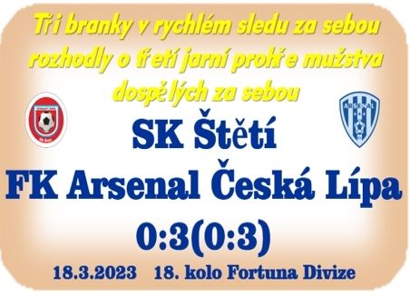 V 7. minutě chtěli hosté domácí překvapit z nakrátko rozehraného volného přímého kopu, ale Matěj Šimon mířil vedle. V 10. minutě se nerozpakoval vystřelit Tomáš Petr, ale pro Michala Krále v brance České Lípy to byla snadná práce. Ve 23. minutě jsme zahrávali první roh, kopnul ho Jiří Vokoun, ale nic jsme z toho nevytěžili. Ve 30. minutě zahrával Patrik Havel volný přímý kop, ale ani tato situace nepřenesla žádnou velkou šanci a Václav Čížek si ve vápně pro míč lehce došel. Ucho s brankami, bohužel pro nás se utrhlo ve 32. minutě. Jiří Neuman až příliš laxně rozehrál balón na polovině a to se nám vymstilo měrou vrchovatou. Míč se před brankou dostal na volného Matyáše Kazdu a ten otevřel skóre zápasu 1:0 pro hosty. Naděje na vyrovnání se urodila ve 35. minutě, ale střelu Jiřího Vokouna zablokoval Martin Bulejko. Další brance hostů pomohla evidentně nebezpečná hra vysokou nohou Martina Žižky, po ní se míč dostal na kopačky Davida Halbicha a nezbylo než jít pro míč do sítě. Konec všem zlým momentům to ale v sobotu dopoledne nebyl ještě konec pro naše mužstvo. O 3 minuty později si Václav Čížek v brance na míč jen tak lehce sáhnul a toho využil Matěj Šimona, aby přihrál Martinu Žižkovi a bylo to 3:0. Byli jsme na ručník. V závěru 1. poločasu se zahrával ještě volný přímý kop na jedné i druhé straně. Nejprve Jiřího Vacka vychytal brankář hostů a na druhé straně si podobně počínal Václav Čížek ve štětské brance. Tutovka se urodila v 1. minutě nastavení. Ocitl se v ní Jiří Vokoun po báječné přihrávce od Tomáše Petra, ale míč poslal mimo branku. Hned po změně stran mohli jít hosté do čtyřbrankového vedení. Ve středu hřišti už poněkolikáté v tomto utkání jsme přišli o míč a ještě, že Martin Žižka z malého vápna prázdnou branku přestřelil. Následovala série volných přímých a rohových kopů na obou stranách, ale žádný z nich k úspěchu nevedl. V 57. minutě se do cesty útočníkovi hostů postavil vybíhající Václav Čížek a vyfasoval žlutou kartu. V 60. minutě obešel naše 2 obránce Matyáš Kazda, ale brankáře překonat nedokázal. V 62. minutě se z ničeho nic zjevil před brankou hostů Vojtěch Pokorný, zkoušel zahrát na housle a proti byl brankář. V 64. minutě zahrával volný přímý kop xxx, míč se snesl do vápna, aby nakonec skončil v síti, ale byl odmáván ofsajd Michala Obrtlíka, který se snad míče ani nedotkl. Naše radost ze vstřelené branky byla předčasná. V 71. minutě nám hodně zatrnulo, když Matěj Šimon z několika metrů prázdnou branku přestřelil. Ale ona by stejně neplatila, protože to byl ofsajd. Tak jak se blížil závěr zápasu, tak jsme se snažili stále více docílit aspoň čestného úspěchu, ale bohužel jsme se dopouštěli hrozivých chyb v rozehrávce a hosté z rychlých kontrů mohli ještě vedení navýšit. V 76. minutě zachraňoval Václav Čížek v brance a v 85. minutě branku přestřelil Matyáš Kazda. A i když jsme se v závěru snažili docílit čestného úspěchu, tak jsme se nedočkali a prohráli 3:0.