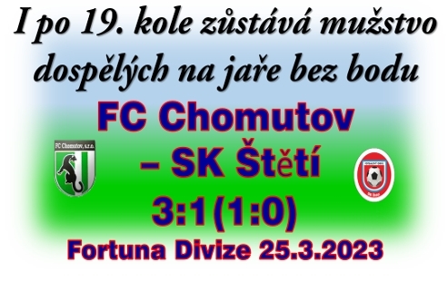 Začali jsme také dobře a hned v 5. minutě se rohového kopu ujal Jiří Vokoun, ale domácí Zimba Longu a hlavou dopravil míč do bezpečné vzdálenosti od branky. 8. minutě zahrávali domácí volný přímý kop 10 metrů od půlící čáry. Míč proletěl přes celé vápno a na zadní tyči se objevila hlava Zimba Longy a nebýt skvělého zákroku Václav Čížka v brance, tak jsme mohli rychle prohrávat. Našeho druhého rohu v 15. minutě se opět ujal Jiří Vokoun, ale ani z této standardní situace se nic neurodilo. Do třetice jsme kopali roh ve 24. minutě. Tentokrát se k němu postavil Muamer Mešič, ale opět z toho nic nebylo. Ve 28. minutě téměř všichni naši hráči křičeli „ Ne, Ne, Ne“. Jinuk Kim se přesto rozhodl, že pošle hlavou malou domů a zle se nám to vymstilo. Jeho úmysl odhalil Filip Schreiner. Míče se zmocnil Chomutov a šel do vedení 1:0. Do kabin na přestávku se nám s jednobrankovým mankem jít nechtělo, tak to z velké dálky ve 33. minutě zkusil Jiří Vokoun, ale Radim Švejda strážící domácí branku velké starosti neměl. Ve 42. ještě zaskočili domácí obranu Tomáš Petr, ta stačila ještě zareagovat a vyrovnání z toho nebylo. Naopak ještě v poslední minutě první části jsme za cenu rohového kopu museli odvracet hrozící nebezpečí z kopaček domácích. Hned po změně stran jsme nebezpečně zaútočili, a když už se zdálo, že se dostáváme do brankové příležitosti, tak vyletěl nad hlavu praporek asistenta rozhodčího signalizující postavení mimo hru. Štětští fanoušci dávali hodně nahlas na vědomí, že s verdiktem nesouhlasí. Zcela opačná situace se odehrála o 5 minut později na druhé straně, ale bohužel s opačným rozhodnutím a o to smutnější to bylo, že jsme šli do branky pro míč podruhé. Gól padnul po rohu, kdy se většina hráčů domnívala, že branka padla z postavení mimo hru. Bohužel v Chomutově stejně jako na podzim chyběla kamera a tak musíme výroku rozhodčího věřit. To by jsme ale museli, i kdyby zde kamera byla. Odpověděli jsme rohem v 52. minutě, ale stejně jako všechny předchozí to úspěšně neskončilo. V 58. minutě mohli domácí ještě svůj náskok navýšit, ale střela po rychlém útoku skončila vysoko nad brankou. Běžela 60. minuta utkání když po pravé straně domácí obrany proletěl s míčem Jiří Vokoun, prostrčil ho na Vojtěcha Pokorného, ale ten se ho snad lekl a mezi 3 tyče ho dopravit nedokázal. V 60. minutě přišel na hřiště střídající Tomáš Mikina a za 4 minuty byl na konci úspěšné akce našeho týmu, která znamenala snížení náskoku domácích na 1:2. Bylo to po dlouhém centru Muamera Mešiče a přihrávce Jiřího na již zmiňovaného Tomáše Mikinu. Rázem jsme vycítili šanci na vyrovnání a domácí přitlačili na jejich polovinu. Po obléhání chomutovské branky 72. minutě měl ostrými nabito Jiří Vokoun, ale z hranice velkého vápna branku přestřelil. V 77. minutě kopal volný přímý kop Vojtěch Pokorný, ale centr byl až příliš dlouhý a skončil mimo hřiště. V 90. minutě jsme kopali rohový a kop a do vápna soupeře se vydal i brankář Václav Čížek. Vyrovnání to nepřineslo, naopak ve 2. minutě nastavení namazal soupeři nepřesnou přihrávkou Muamer Mešič a toho ke stanovení definitivy využil gólem na 3:1 střídající Lukáš Vymyslický. Tím naše naděje na vyrovnání zhasla.