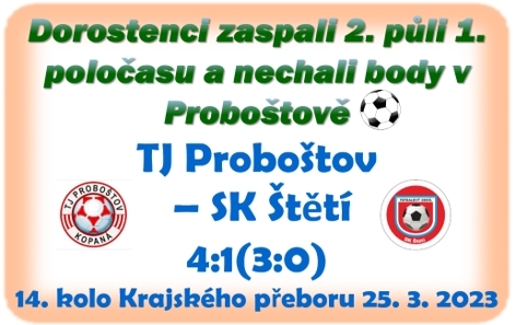Jarní premiéra mužstva dorostu 11. celku tabulky v Krajském přeboru se odehrála na předměstí Teplic v Proboštově, kde je v sobotu čekal domácí celek 8. tým tabulky. Na poslední předzápasový páteční trénink dorazily nepříjemné zprávy od Michaela Migy a Jakuba Strachy, kteří se z důvodu zranění omluvili ze sobotního zápasu. K dispozici není také dlouhodobě zraněný Daniel Hromy a do Ústí n.L. přestoupil v zimním období nejlepší střelec týmu Petr Hůrka. Věděli jsme, že bez klíčových hráčů nás nečeká jednoduché střetnutí. Do utkání jsme ale vstoupili dobře a do 20. minuty jsme byli lepším týmem než domácí a drželi je na vlastní polovině. Postupně náš výkon ale uvadal. Začali jsme chybovat v rozehrávce, o míč jsme lehce přicházeli a domácí začali zápas otáčet ve svůj prospěch. Ve 29. minutě si navíc slabší chvilku vybral strážce naší branky Dragan Kosorič, míč mu proklouzl mezi rukavicemi a do prázdné branky ho poprvé uklidil na 1:0 Jakub Brodský. Inkasovaná branka nám svázala nohy ještě více, dopouštěli jsme se jedné chyby za druhou a ve 39. minutě nás krásnou střelou zpoza vápna k tyči potrestal Jakub Brodský brankou na 2:0. O 3 minuty později završil Jakub Brodský své vystoupení v 1. poločase hattrickem. Po přihrávce z pravé strany zůstal před brankou zcela neobsazen a hlavou upravil na 3:0. Ještě do poločasu mohl nepříznivý vývoj utkání korigovat Jan Kroupa, kterého do šance poslal Radim Paďour, ale branku těsně minul vedle levé tyče. O přestávce byla v kabině slyšet pobídka trenéra, aby jsme více stříleli, že jim to nezakázal, protože jinak branky střílet nebudou. Hráči se to v úvodu 2. půle, kterou začali stejně dobře jako první, snažili plnit, ale opět nezafungovala obranná činnost a v 58. minutě jsme nechali bez povšimnutí koho jiného než Jakuba Brodského, který pláchnul všem a svojí čtvrtou brankou v zápase zvýšil vedení domácích už na 4:0. Malou náplastí na bolavý průběžný výsledek 0:4 byla branka našeho týmu v 70. minutě. Krásný centr Miroslava Novotného na hlavu Jakuba Jeníka znamenal snížení náskoku na 1:4. Domácí jsme zatlačili na jejich polovinu, a i když jsme naráželi na obranný val domácích, tak jsme si brankové příležitosti vypracovali. Do odraženého míče se na hranici velkého vápna opřel Břetislav Kafka, brankář domácích Michal Ježek míč před sebe jen vyrazil, ale Daniel Ivanič mu ho hlavou vrátil zpět do náručí. Další velkou příležitost měl po krásné přihrávce od Milana Kača Jakub Vejl, který se řítil sám na brankáře, ale ten nohou vyrazil balón do bezpečí. V 85. minutě to levačkou z dobrých 18 metrů zkusil Daniel Ivanič, brankář míč vyrazil k nohám Miroslava Novotného, ale ten k velké škodě prázdnou branku netrefil a skončilo to tak 4:1 v náš neprospěch.