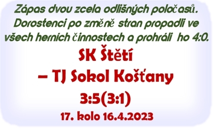 Před týdnem dorostenci na den Velkého pátku prohráli ve Varnsdorfu vysoko 7:0. V jarní premiéře na domácím trávníku je v tomto utkání čekal přijatelnější soupeř z Košťan, který se pohybuje ve středu tabulky. Zápas se hrál v neděli před obědem a v úvodní čtvrthodince se mužstva poznávala. Vzájemně se oťukávala, hledala skulinky v obraně, ale větší branková příležitost k vidění nebyla. Postupně se to ale měnilo a bylo to naše mužstvo, které bylo nebezpečněší a dokázalo se dostávat blízko na dostřel hostující branky. To už běžela 16. minuta, když po pravé straně všem pláchnul Michael Miga a skvěle si poradil i s brankářem. Šli jsme do vedení 1:0. Hosté sice hned po rozehrávce ze středového kruhu odpověděli rohovým kopem. Obrana si ale poradila a společně se zálohou a útočníky se vydala na polovinu soupeře, kde v 19. minutě Štětí zahrávalo z dobrého střeleckého postavení volný přímý kop. Po překvapivé přihrávce se levačkou do míče opřel Adam Vích a brankář hostů konečky prstů vytěsnil míč na roh. Stejnou výhodu na opačné straně hřiště měli o chvilku později i hosté, ale trefili jen početnou zeď domácího celku. Překvapit střelou z dálky zkoušel ve 25. minutě Jakub Strach, ale balón nabral jak na lopatu a ten skončil vysokou nad Košťanskou brankou. Příležitost srovnat měli hosté ve 27. minutě, když štětskou tyčku rozezpíval Adam Matějovský. I když měli hosté tuto velkou šanci, tak to bylo naše mužstvo, které stupňovalo herní aktivitu směrem dopředu a přicházely i brankové příležitosti. Po přihrávce od Jakuba Strachy se v tutovce ve 28. minutě ocitl Miroslav Novotný mířící na vzdálenější tyč, ale míč v síti neskončil. Ve 38. minutě zafungovala skvělá spolupráce mezi Danielem Ivaničem, který nejištně poslal do koncovky Michaelu Migu a domácí se mohli radovat podruhé. 2:0. Neuběhla ani minuta a Michal Miga mohl završit hattrick brankou na 3:0, ale další radost překazila tyčka. Domácí to ale nezaskočilo a parádní fotbalové představení pokračovalo. Po rohu ve 40. minutě chybělo málo, aby po hlavičce Daniela Ivaniče zapadl balón mezi 3 tyče. Jen na malou chvilku udělala mrzutost našemu týmu branka hostů ve 44. minutě, kterou vstřelil Lukáš Mergl a znamenala snížení náskoku na 1:2. Odpověď přišla bleskově a ještě než si hráči odešli na přestávku, tak to byl kdo jiný než Michael Miga, který měl obuty kopačky sprinterky a stačil ještě upravit na poločasových 3:1 pro naše mužstvo. Bohužel do 2. půle vyběhlo ve štětských dresech na hřiště úplně jiné mužstvo. Utěšený výkon z 1. poločasu zůstal v kabině a na tribuně mezi fandícímu děvčaty. Nesoustředěnost a podcenění soupeře se projevily v plné parádě. Už ve 49. minutě kopal hostující Jakub Černý penaltu a snížil na 2:3. O chvilku později se chvělo břevno naší branky a vyrovnání viselo na vlásku. Na polovinu soupeře jsme se dostávali sporadicky a to co v 1. poločase fungovalo, dlouhé nákopy na nabíhající útočníky, především Michaela Migu byly zapomenuty. Nakonec jsme byli rádi, že jsme v 57. minutě kopali aspoň rohový kop, ze kterého jsme stejně ale nic vytěžit nedokázali. Dobrý výsledek se pomalu začal hroutit jak domeček z karet. V 64. minutě byl po volném přímém kopu Dragan Kosorič u míče o chvilku později a Lukáš Mergl svojí druhou brankou v zápase srovnal na 3:3. Největší příležitost a jednou po změně stran si naše mužstvo připravilo v 72. minutě, ale hlavička Daniela Ivaniče mezi 3 tyčemi neskončila. Definitivní podobu zápasu, z našeho pohledu ne moc příjemnou, přinesla poslední desetiminutovka. Hosté v průběhu 2. poločasu moc dobře vycítili, že naše mužstvo opustilo hřiště a již nedokáže vzdorovat. V 82. minutě jsme po rychlém útoku po brance Marka Lučka poprvé prohrávali. Nezůstalo jen u jedné branky, protože za další minutu bylo rozhodnuto s konečnou platností. Na konečných 5:3 upravil Jakub Černý.