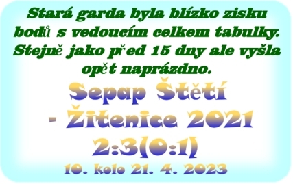 Vstup do zápasu se ale nepovedl a v 8. minutě šli hosté do vedení 1:0. Nutno podotknout, že to bylo ještě v době, kdy byl v brance hráč z pole, protože brankář staré gardy Sepapu na hřiště doběhl až v průběhu utkání. V 11. minutě jsme si kopli roh, ale žádná velká starost pro hosty odkopnout míč do bezpečí to nebyla. Ve 13. minutě letěl míč po centru nebo střele jednoho z hráčů hodně dlouho, a když pak dopadl z vrchu na břevno naší branky, tak jsme si oddechli. V 18. minutě nechybělo moc, krok, aby Jiří Vokoun senior dosáhl na nabídku Ondřeje Vosmíka a vyrovnal na 1:1. Ve 24. minutě to byl opět Jiří Vokoun, který pádil na branku soupeře, ale ve vápně byl zastaven obráncem a i když jsme se podívali na rozhodčího, tak to penalta nebyla. Velkou šanci měl i soupeř o 2. minuty později. Po zbytečném váhání s rozehrávkou jsme o míč přišli a střela na vzdálenější tyč skončila metr vedle branky. Ve 35. minutě kopal Dušan Tesařík volný přímý kop, ale trefil jen zeď Štětí. Stejnou výhodu mělo i naše mužstvo o minutu, ale Pavel Čermák poslal míč metr vedle pravé tyče. V závěru poločasu po rohu hosté ještě zatopili před naší brankou, ale nakonec jsme horko přežili a tak na ukazateli skóre svítil o poločase výsledek 0:1. Hned po rozehrávce 2. části se směr Žitenice vydal Pavel Čermák, napřáhl ke střele. K překvapení všech a k naší smůle skončil balón na břevně. Hosté odpověděli ve 44. minutě střelou z velké dálky, která ale skončila mimo konstrukci branky. V 50. minutě se urodilo vyrovnání a stálo zato. Jeden z nejhezčích gólů kariéry vstřelil Miloš Vála. Obešel jednoho hráče, poradil si i s druhým obráncem a pak střelou z dobrých 19 metrů vymetl pavučinku mezi spojnicí tyče a břevna. Za další 3. minuty jsme mohli jít dokonce do vedení, ale Jiří Vokoun téměř z brankové čáry míč do branky nedostal. Jak už to ale bývá. „Nedáš, dostaneš“. Hned z protiútoku přišla přesná střela k pravé tyči a brankář se natahoval marně. Hosté šli opět do vedení. Tentokrát 2:1. Pověstný střelec přímých kopů Jakub Červinka měl tuto výhodu v 67. minutě. Střela prudká byla, ale bohužel chyběla přesnost. Trefil jen zeď. Vytouženého vyrovnání jsme se ale přeci jenom v 70. minutě dočkali. Po tvrdé střele se míč odrazil zpět na nohu Jana Arazima a ten už nezaváhal. Srovnal na 2:2 a o minutu později se urodila dokonce další příležitost, po které jsme mohli jít i do vedení. Bohužel, se tak nestalo, hosté opět zabrali a 5. minut před závěrečným hvizdem šli potřetí do vedení. Střela z otočky nakonec znamenala prohru 3:2.
