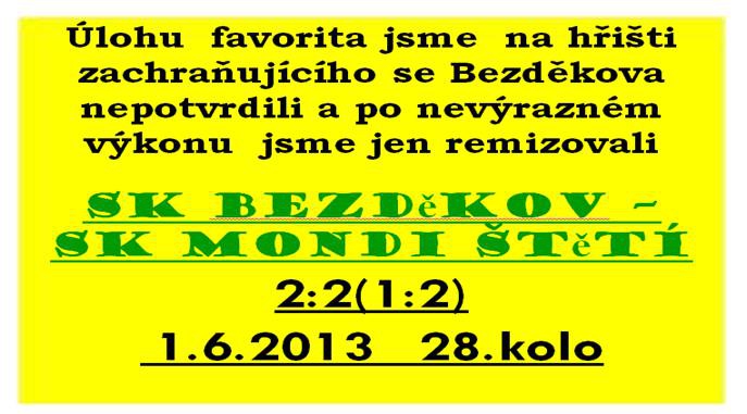 Po 2 zápasech doma, kde jsme se zrovna s dobrou formou a střeleckou produktivitou nepotkali, jsme zajížděli na hřiště nedalekého, v soutěži se zachraňujícího Bezděkova. Před zápasem byly slyšet i takové hlasy, že to Štětí Bezděkovu nechá, ale všechno to byly výmysly a nepotvrzené informace. Navíc, kdo dnešní zápas viděl, tak musel uznat, že to bylo spíše naopak. Derby, jak má být, ve kterém jedno mužstvo druhému nedarovalo vůbec nic. Běžela 6. minuta, když naše jedenáctka rozehrála velmi hezkou kombinaci, na jejímž konci postupoval sám na brankáře Sailera Stejskal a svojí 12 brankou v tomto soutěžním ročníku přivedl naše mužstvo do vedení 1:0. Naší druhou branku mohl přidat Slavoj Tichý v 15. minutě, když mu obrana nevěnovala vůbec žádnou pozornost. V zakončení se ale unáhlil a levou nohou míč poslal na přilehlou železniční trať Praha-Děčín. Bezděkov se do zápasu nadechoval pomaleji, ale po 15 minutách se stal nebezpečnějším a aktivnějším mužstvem. Na ukazateli svítila 17. minuta a šance domácích volala po vyrovnání. Nestalo se a hned z protiútoku to mohlo skončit po přihrávce Beláka na Kalu obráceně. Ve 25. minutě zůstal dlouhé vteřiny nehlídán Pištora. Jeho střela z 20 metrů byla nádherná a Vaškovi Michovskému v naší brance nelze vytknout, že na míč nedosáhl. 1:1 trvalo přesně 4 minuty. Nešetrným zákrokem byl v pokutovém území sražen k zemi Šimral a rozhodčí Bouma nařídil penaltu. Suverénně ji střelou doprostřed branky proměnil Stejskal a po druhé v tomto zápase jsme vedli. (2:1) Domácí lavičku ovládly emoce a hanlivé výroky na adresu rozhodčího, ale i naší střídačky byly slyšet hodně daleko. Škoda! S Bezděkovem jsme byli vždy dobrými přáteli a věříme, že pár jedinců na tom nic nezmění ani do budoucnosti. Poslední slovo v prvém poločase měli minutu před odchodem do kabin domácí. Střelu na nevyzpytatelném mokrém terénu musel Michovský vyrážet na roh. Horší začátek druhého poločasu jsme v tomto soutěžním ročníku nezažili. Ještě z něho neuběhla ani minuta, když se naše obrana zachovala lážo, plážo a Job využil střelu placírem ke srovnání na 2:2. Ale ani po vyrovnávací brance jsme se neprobudili. Kombinace veškerá žádná, a když už jsme si přihráli, tak to rychle končilo na kopačkách soupeře. Michovský se mezi tyčemi nenudil a v 53. minutě jsme mu mohli poděkovat, když vyrážel míč na roh, že obrat v zápase nebyl dokonán. Domácí hráli bojovněji. Na jejich hře bylo znát, že body potřebují více než naše mužstvo. Snaha vyhrát by měla být ale v každém zápase a to jsme si začali uvědomovat až ve 2 dějství druhého poločasu. Ransdorf se na brankové čáře soupeře po míči natahoval, jak to jen šlo. Míš ale doputoval za branku. V 64. minutě neprostřelil pravou nohou obranný val domácích Stejskal. Po zadu nezůstali střelecky ani domácí. Pokolikáté už v tomto utkání musel ze svého brankářského umění vytahovat bravurní zákrok Michovský. V 74. Minutě se mohl do listiny střelců zapsat střídající Rejman. Nedal, i když všichni naši hráči signalizovali ruku bránícího hráče. Lavička domácích tentokrát mlčela. Střelu z volného přímého kopu v dobrém palebném postavení zastavila zeď štětské obrany. V zahazování šancí vystřídal Rejamna Stejskal. Tentokrát levou nohou branku vůbec netrefil. V 81. minutě si míč k noze velmi hezky přišpendlil Rejman, ale střelu zastavily nohy golmana. Z našich kopaček už to bylo všechno. Získat 3 body v úplném závěru zkusili ještě domácí, ale ani brejk po pravé straně a 2 standardní situace brankou neskončily. Náš výkon nebyl dobrý. Hráli jsme hodně nevýrazně, a i když počasí ani terén nebyly ideální, tak fanoušci čekali více. Za týden nás čeká poslední domácí zápas v tomto ročníku a v zájmu fanoušků, ale i hráčů je, se s ním rozloučit vítězně.