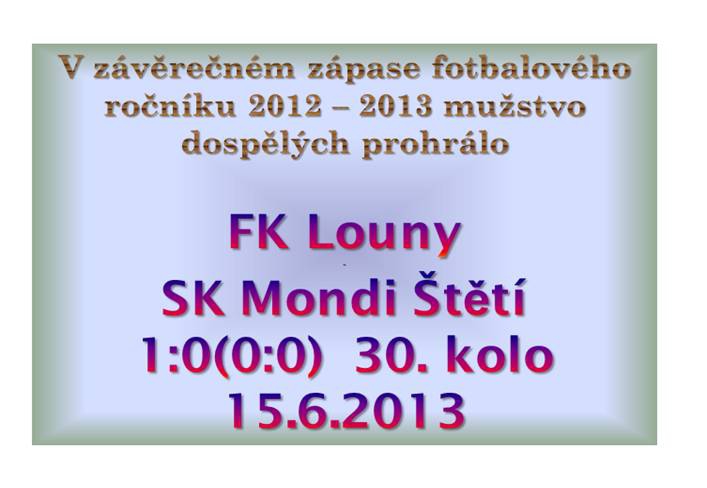 Do Loun k poslednímu zápasu letošního ročníku jsme si jeli nejenom pro nějaké ty body, ale také pro pohár Ústeckého přeborníka, jehož předání bylo naplánováno hned po zápase. Začali jsme velmi dobře a do 6. minuty jsme si vypracovali 3 gólovky. Kala i Stejskal s nimi naložili nepřesně a nic z toho nebylo. I v dalších minutách jsme byli nebezpečnější a naopak útoky domácích končily často v ofsajdové pasti. Před brankou domácích bylo více vzruchu a několikrát už se zdálo, že stačí do míče jen pořadně kopnout a skončí v síti, jako třeba v 11. minutě při příležitosti Kaly. V ideální pozici si ve 22. minutě přichystal míč k volnému přímému kopu Stejskal a fanoušci ze Štětí už tipovali branku. Kdeže to. Míč dolétl pouze k dobře postavené zdi. To už ale naše hra začala ztrácet glanc a uvadat jak květiny, které vodu dlouho neviděly. Na dlouhou dobu naše poslední šance se odehrála ve 34. minutě, když střídající Mencl, který nahradil zraněného Píchu, se hezky dostal až k přesné přihrávce na Kalu, ale jeho koncovka v tomto zápase „Řekněme“ byla žalostná. Posledních 10 minut prvé půle patřilo domácím. Nejprve jeden z jeho hráčů prošel naší obranou jednoduchým způsobem a jen nepřesné zakončení nás zachránilo. Pak namazal špatnou přihrávkou Ransdorf a Michovský musel předvést nejlepší zákrok prvního poločasu. Nebyla to ale šance v prvním poločase poslední. 4 minuty před odchodem do kabin se v perfektním střeleckém postavení objevil hráč Loun a jeho pumelenice nabrala směr snad 3 metry na d branku. Ve druhém poločase jsme se stáhli na vlastní polovinu a režii zápasu převzali domácí. Michovský musel zakročit proti tečované střele z volného přímého kopu a vyrazit míč na roh. Pak se přiznal k rohu a sklidil potlesk. Škoda, že na druhé straně jsme se takového fairplay nedočkali, i když k tomu 2 příležitosti byly. Museli jsme čelit i 3 rohům v řadě, kdy jsme před naší brankou museli zůstali zakopáni přes 2 minuty.Přísný volný přímý kop nařídil proti naší brance rozhodčí Prágl, ale kapitán Loun přestřelil. V běžeckém souboji na druhé straně vítězil Kala, ale byl zastaven Říhou za cenu nedovoleného zákroku. V 60. minutě si hezky poradil s nebezpečnou střelou Michovský v naší brance. U zadní tyče byl ve výskoku Šimral, ale míče z kopačky Stejskala z volného přímého kopu se lekl a hlavou netrefil. Náš výkon ve druhém poločase nebyl dobrý, hráči zůstávali bez pohybu, nápadu a od fanoušků jak domácích, tak hostů si vysloužili špatnou známku. Mohlo to být jinak, kdyby se Kala v jasné šanci neunáhlil a po přihrávce Rejmana vysoko nepřestřelil. Kala však svůj den neměl a musel čelit i výsměšným výkřikům domácích fanoušků. To Louny se vyznamenaly v 80. minutě, když nádhernou přihrávku na nabíhajícího spoluhráče nedokázali 2 bránicí hráči zastavit a Střelec dostál svému jménu, když míč poslal za záda Michovského. 0:1 . Až teprve potom jsme se trochu probudili a začali honit čas, abychom se pokusili aspoň vyrovnat. Nic závratného z toho ale nebylo. Domácí už si vítězství pohlídali a náš kolektiv po nepovedeném výkonu musel soupeři poblahopřát k vítězství. Radost jsme po zápase přeci jenom ale zažili. Tou bylo předání poháru a medailí našemu mužstvu z rukou předsedy Ústeckého krajského fotbalového svazu Josefa Tancoše a sekretáře Jiřího Suchánka za vítězství v přeboru pro ročník 2012-2013. Bylo to příjemné.