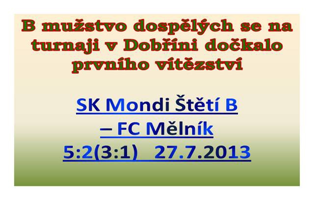 Naděje na postup do skupiny o 1. až 4. místo vyhasly už před tímto zápasem, protože VOŠ Roudnice n.L. rozstřílela Bezděkov vysoko 7:2. I tak byl ale tento zápas zajímavý. V sestavě účastníka I.B třídy se objevilo několik hráčů, kteří v minulosti ve Štětí působili. Jiskra, Vernek v mužstvu dospělých a Procházka s Douděrou v dorostu. Před týdnem FC Mělník 2x vyhrál a postup měl naopak od našeho mužstva zajištěn. Hned v úvodu si vypracoval také hned 2 volné přímé kopy, ale míče museli podavači míčů hledat v okolních polích. Jako první v našem dresu vystřelil Malý, ale jeho pokus skončil vysoko nad. To v 11. minutě se do pokutového území Mělníka vypravil Vodička a byla radost sledovat jeho kličky a excelentní zakončení na 1:0. Škoda, že stejný hráč ve středu hřiště o 3 minuty později zbytečně ztratil míč a soupeř vyrovnal na 1:1. S tím se ale nesmířil Peterka a hned po rozehrávce vyslal z 18 metrů tak jedovatou střelu, která před brankářem ještě nepříjemně skončila, že jsme se opět jsme se ujali vedení. Zvýšení náskoku měl na kopačce Pavel Vaněk, ale jeho pohotovou střelu stačil brankář odvrátit do bezpečí. Po delší době z důvodu zranění se na hřišti objevil také Matoušek a byl to on společně s Peterkou, kteří ve 29. minutě zamotali hlavou obraně Mělníka a chybělo jen přesné zakončení. Po půlhodině nám nevyšla ofsajdová past, Jiskra byl u míče dřív než vybíhající brankář Jiří Vaněk, ale stáli při nás všichni svatí, když míč skončil vedle. V závěru poločasu začala kralovat naše kombinační hra a některé akce byla opravdu radost sledovat. Jaká to proměna oproti zápasu před týdnem s Voškou. Malý vyzval ke střele Peterku a ten dloubákem jen těsně minul. Hezky vystřeli Malý a kdo vík jak by to dopadlo, kdyby se do cesty nepostavil jeden z obránců. Zasloužené branky jsme se ještě v prvém poločase přeci jenom ještě dočkali. Autorem gólu na 3:1 byl Malý ve 38. minutě, kterému to připravil na podnose Poráč. Že nemůžeme ani na chvilku polevit jsme se přesvědčili v 51. minutě. Příliš mnoho prostoru jsme poskytli hráči Mělníka, který měl čas míč zpracovat, připravit si ho ke střele a snížit na 2:3. Odpověď přišla rychle. Dlouhý centr dolétl až nohám Peterky a ten už si s balónem poradil, jak je mu vlastní a upravil na 4:2 v náš prospěch. Hostům začali docházet síly a snad jen pokus Verneka z volného přímého kopu, který sice skončil vysoko nad, stojí za zaznamenání. To chuť do hry od Peterky byla úžasná. Prošel přes polovinu hřiště až před branku a zde už pro svátečního střelce Vláďu Poráče nebyl problémem zvýšit na 5:2. I v dalších minutách to byl náš kolektiv, který si šance vypracoval. Břevno po střele Zídka v Dobříni zvoní ještě teď. I pokus Malého, který skončil sice vedle, byl hodně slibný. V úplném konci měli hosté možnost ještě zahrozit z volného přímého kopu, ale byla to jen labutí píseň a tak rozhodčí Prágl i z důvodu obrovského vedra zápas ukončil už v 85. minutě. Dobrý výkon i výsledek. Teď ho ještě zítra potvrdit ve 14. hodin proti účastníkovi Ústeckého přeboru FK Českému Lvu Neštěmice.