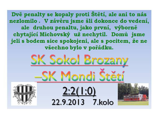 Okresní derby slibovalo hezkou podívanou a početnou diváckou kulisu. Náš soupeř se letos hledá, zatím se mu nedaří a na kontě měl před tímto zápasem pouhé 3 body. To naše mužstvo si z posledních 3 zápasů připsalo na konto 9 bodů, a i když jsme věděli, že v Brozanech už by další ztráta bodů pro domácí znamenala menší poplach, tak jsme s početnou diváckou podporou na zdejší hřiště s poraženeckou náladou nepřijeli. Začalo se dost zostra a Lukáš Stejskal hned v 1. minutě nevybíravě fauloval a rozhodčí bez jakéhokoliv varování vytáhl žlutou kartu. Škoda, že rozhodčí Klupák nebyl stejně, tak přísný i na domácí při zatažení za dres při kontaktu hráče Brozan na Rejmana o pár minutu později. Domácí se do nás zakousli od prvních minut a ani na chvilku nám nedali odpočinout. V 10. minutě byl navíc zákrok jednoho z našich hráčů posouzen v nebezpečné blízkosti šestnáctky jako nedovolený a marné bylo rozhazování rukama „Pane rozhodčí, bože za co“. Trestný kop byl, ale zahrán parádně. Michovský ač skákal, jak mohl, tam na míč nedosáhl. Domácím taktika co nejrychleji vstřelit branku tedy vyšla v 10. minutě. Ve 12. minutě nám po střele domácích zatrnulo znova, když míč skončil těsně mimo. Naše hra v těchto okamžicích nebyla dobrá a poprvé na polovinu soupeře do nebezpečné blízkosti na dostřel branky jsme se dostali až v 15. minutě. Byl to dokonce obránce Šimral, který z brankové čáry zkusil prostrčit míč před branku na spoluhráče. Stejný borec o 2 minuty později vyfasoval za nehezký zákrok bez slitování žlutou kartu. Od poloviny poločasu se hra pomalu vyrovnávala a na řadu přišly i gólové momenty kolektivu Štětí. Prudkou střelu zprava adresoval před branku Rejman. Míč poletoval po brankové čáře sem tam, aby nakonec skončil na rohu. Vlastně ne, protože hlavní rozhodčí to viděl jinak a kopalo se od branky. Pak se skácel v pokutovém území Brozan k zemi Stejskal, ale nedovolený zákrok to nebyl. Do další obrovské příležitosti se po půlhodině hry dostal Rejman, ale míč do zívající branky neposlal. 34. minuta, Šimral trefil z první a míč odskokem o zem skončil na tyči. O minutu později diváci obdivovali nádherný výskok Cibulky po rohu, který si zasloužil vyrovnání. Štěstí nám nepřálo a balón orazítkoval pouze břevno. Nejprve smutný a o chvilku později šťastný moment jsme prožili 4 minuty před odchodem do kabin na přestávku. Ruka rozhodčího ukázala na značku pokutového kopu. Michovský si vzpomněl na penaltový rozstřel v poháru s Neratovicemi a střelce domácích vychytal. Co se změnilo na začátku druhého poločasu, byl výkon rozhodčího, který byl ne jenom podle autora tohoto referátu, o něco měně jednostrannější než v první 45 minutovce. Jeho posuzování zákroků vyvolávalo velké pochyby o férovosti řízení tohoto utkání. Jestliže začátek první půle patřil domácím, tak úvodní minuty druhého dějství byly hrány pod naší taktovkou. Stejskal ve 49. minutě připravil gólovku do středu šestnáctky naběhnuvšímu Kuclerovi a ten s ní nepohrdl. K naší velké radosti srovnal na 1:1. Hned z následujícího útoku nás od pohromy a vedoucí branky Brozan uchránilo břevno. Na výlet se vydal Pícha, ale jeho obávaná levačka tentokrát přesná nebyla. Pak jsme také zaznamenali žlutou kartu, kterou viděk hráč domácích Samir Zdiri. V další slibné možnosti po hezké akci se objevil Rejman, ale vedoucí branka se neurodila. Domácí se probrali až v 61. minutě, když po rychlém přechodu do útoku zakončovali nepřesně. Podobně byla i nepřesná hlavička Brozan z hranice malého vápna v 62. minutě. Tříminutovka domácích pokusů vstřelit gól byla završena volným přímým kopem po ruce Píchy. Michovský opět předvedl, že je ve správný okamžik na tom správném místě. Benda v útoku zadělal na gól Cibulkovi, ale jeho levačka k těm silnějším nohám nepatří. 15 minut před koncem zvedali po rohu Rejmana ruce nad hlavu hráči i fanoušci Štětí. Po několika zápasové pouze se hlavou prosadil Hyka a zajistil vedení Štětí 2:1. Měli jsme našlápnuto k dalšímu vítězství. To trvalo 3 minuty, protože pak se ke slovu opět přihlásil rozhodčí Klupák. Za údajnou ruku nařídil penaltu. To už ale žasli i domácí diváci, jak je tento zápas režírován. Z penalty bylo srovnáno na 2:2 a museli jsme se začít bát i o remízu. Vyrovnání Brozany nabudilo a závěr patřil jim. 84. minuta a míč proletěl jen těsně mimo naší branku. 87. minuta zvoní pravá tyč branky Štětí. Na úplný závěr ještě jedna gólovka domácích, která nejenom, že neskončila brankou, ale bylo máváno i postavení mimo hru. Co říci k tomuto utkání a jak ho hodnotit? Remíza odpovídá předvedené hře obou mužstev. Šance byly na obou stranách. Chvilku se dařilo Sokolu, chvilku zase Mondi. 420 diváků vidělo 4 branky a to je také dobrou reklamou na fotbal. Co však toto fotbalové vystoupení pokazilo, byl výkon rozhodčího, který na sebe po celý zápas upozorňoval, že bylo nejenom fanouškům Štětí jasné, kdo má bodovat naplno. Škoda. K fotbalu to nepatří a mužstva okresu společně s rozhodčími okresu Litoměřice odkud je i pan Klupák by se k sobě měly chovat jiným způsobem.