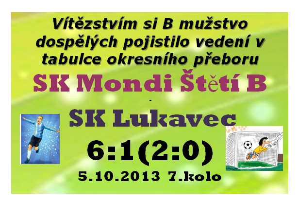 Soupeř, o kterém jsme věděli, že patří mezi ty kvalitní v okresním přebor spoléhající na střelecké schopnosti Udatného, který nakonec ale nebyl ani na lavičce náhradníků. Po minulém kole jsme se vrátili do čela tabulky, ale chleba se začne lámat až v následujících kolech, kdy nás čekají ti hlavní soupeři z čela tabulky, mezi které patří i ten co se představil právě v tomto zápase. Měl také po nedůrazném bránění Gernata první střeleckou příležitost, která skončila v otevřeném náručí Bánovčina. Lukavec se snažil vycházet ze zajištěné obrany a když se k tomu přidala nepřesná přihrávka na našich kopačkách, tak naše převaha vycházela dlouho naprázdno. Když to nešlo kombinačně, tak se toho zhostil Malý z volného přímého kopu v 18. minutě, který posadil míč na hlavu Peterky a uklidňující branka na 1:0 byla na světě. Ve 29. minutě si zakřičel Bánovčin v brance „Pusť“ a pak začal s míčem předvádět riskantní kouzla, ze kterých se divákům tajil dech. Nakonec si oddechli, protože to dobře dopadlo. Další akce nebo spíše střela z velké dálky se urodila z kopačky Peterky. Brankář dráhu letu míče dobře neodhadl a ve 32. minutě jsme vedli už 2:0. Hosty to ale ještě zdaleka nezlomilo. Po faulu Matouška měli k dispozici volný přímý kop a následná zapeklitá situace před naší brankou skončila odkopem do bezpečí. Ještě větší šanci hostů měl Kořínek, ale branku vůbec netrefil. Důležitý moment, který mohl hosty ještě před změnou stran vrátit do hry. Po ní tvrdě vypálil na naši branku Tintěra a od pohromy zachraňoval reflexivním zákrokem Bánovčin. I další nepříjemné momenty na úvod druhé půle jsme přežili a konečný odpor soupeře zlomil v 56. minutě David Mencl. Sice chtěl přihrávat, ale nakonec se odražený míč rozhodl poslat do sítě na 3:0. V 62. minutě už na ukazateli skóre svítila čtyřka. Gernat zaskočil golmana parádní střelou přes celou branku na 4:0. Hosté pomalu rezignovali. Po levé straně se do útoku vydal Gernat , servíroval navrátilci do sestavy Slavíkovi , který s nabídkou nepohrdl a upravil už na 5:0. V 76. minutě hosté smutnili pošesté. Sice reklamovali, že Pilař se do zakončení dostal po faulu, ale bylo jim to málo platné, gól na 6:0 platil. Čestného úspěchu se soupeř dočkal 10 minut před koncem. Střídající Černý byl na hřišti snad minutu, když nešťastně zahrál rukou ve vlastním pokutovém území. Penalty se úspěšně zhostil Kořínek a snížil na 1:6. Ve zbytku zápasu byla k vidění ještě jedna šance na obou stranách, ale skóre už se neměnilo. Cenné a jasné vítězství, které jenom potvrdilo, že naše ambice jsou v tabulce ty nejvyšší. Neusnout na vavřínech a za týden posilněni poctivým tréninkem hurá do Liběšic.
